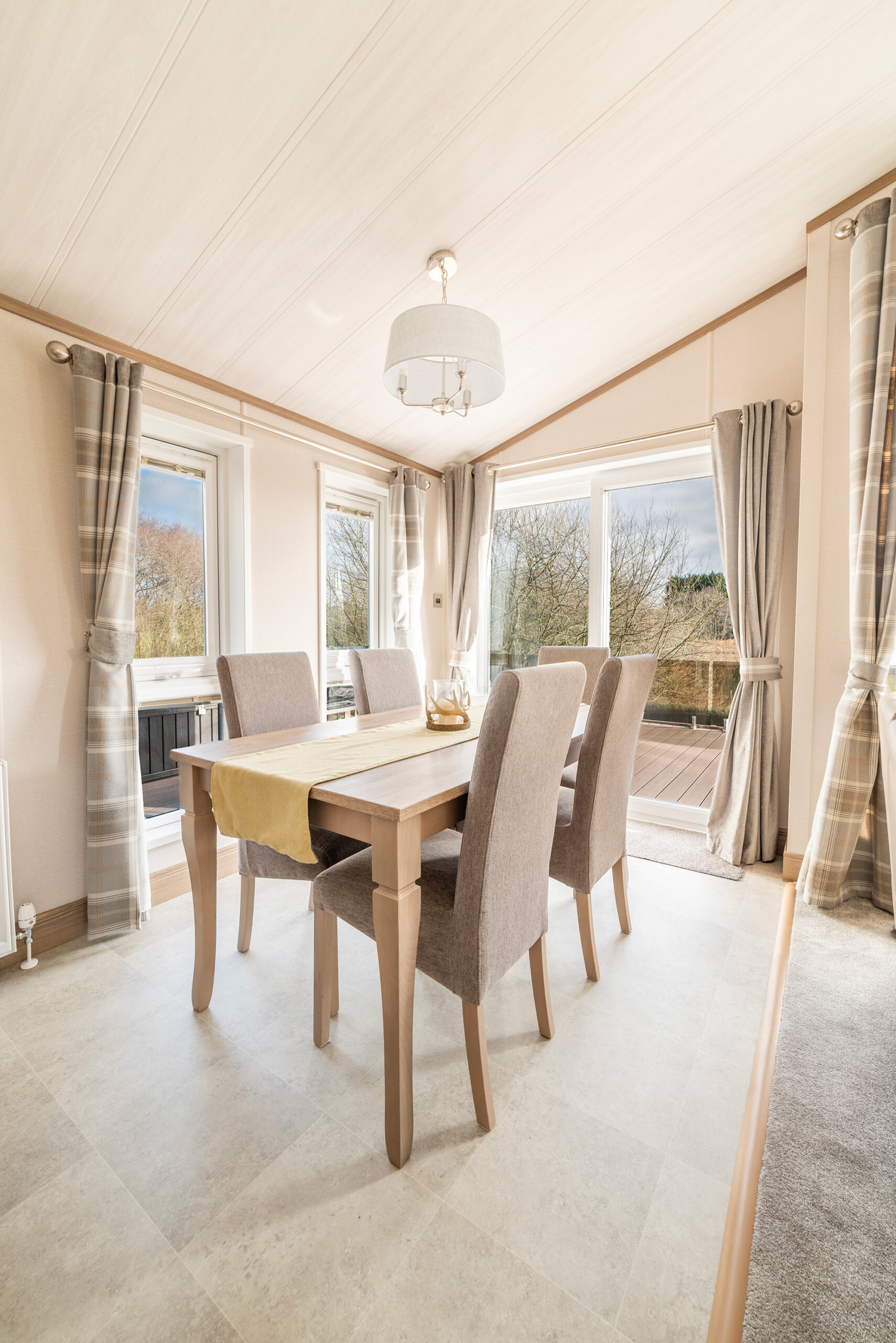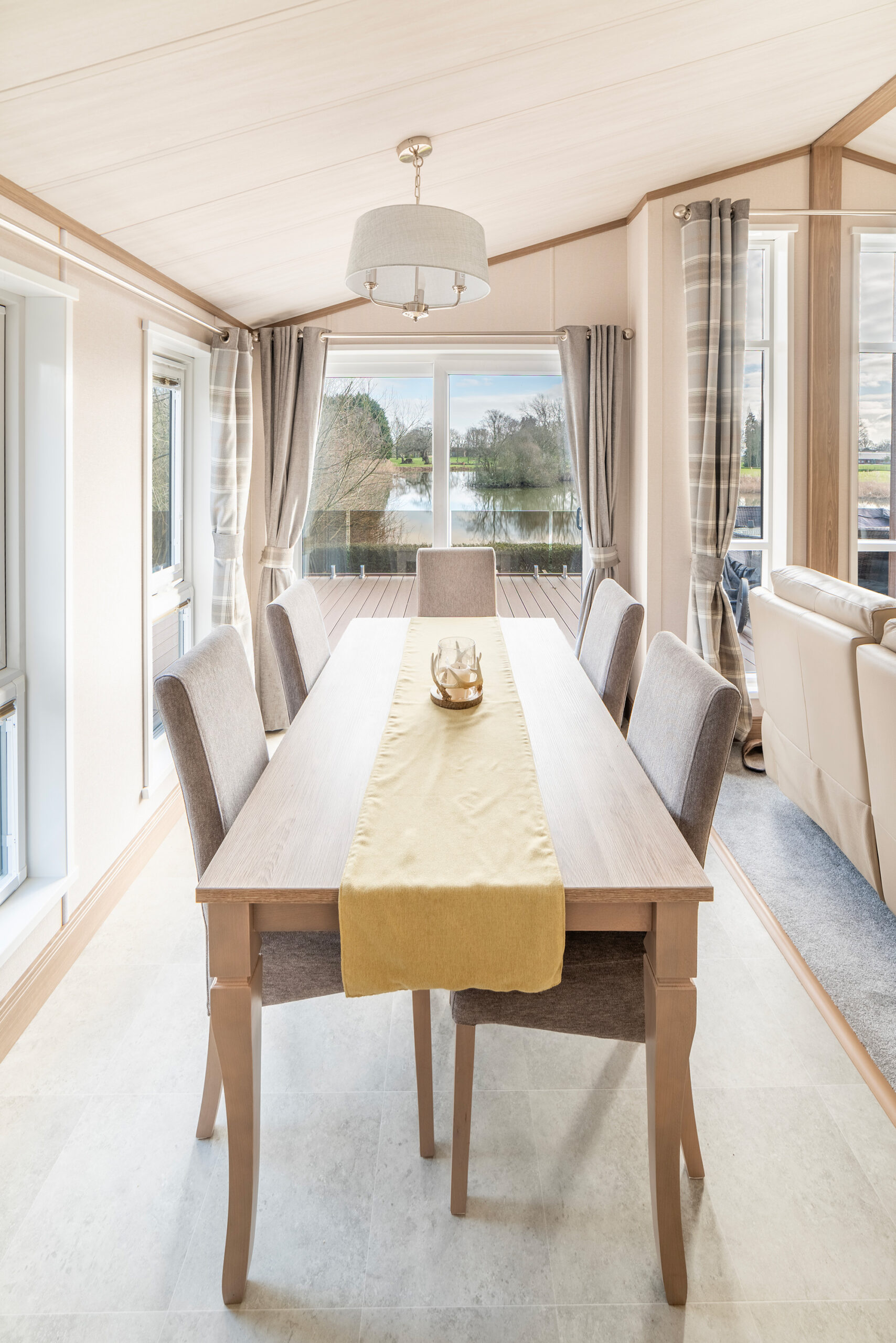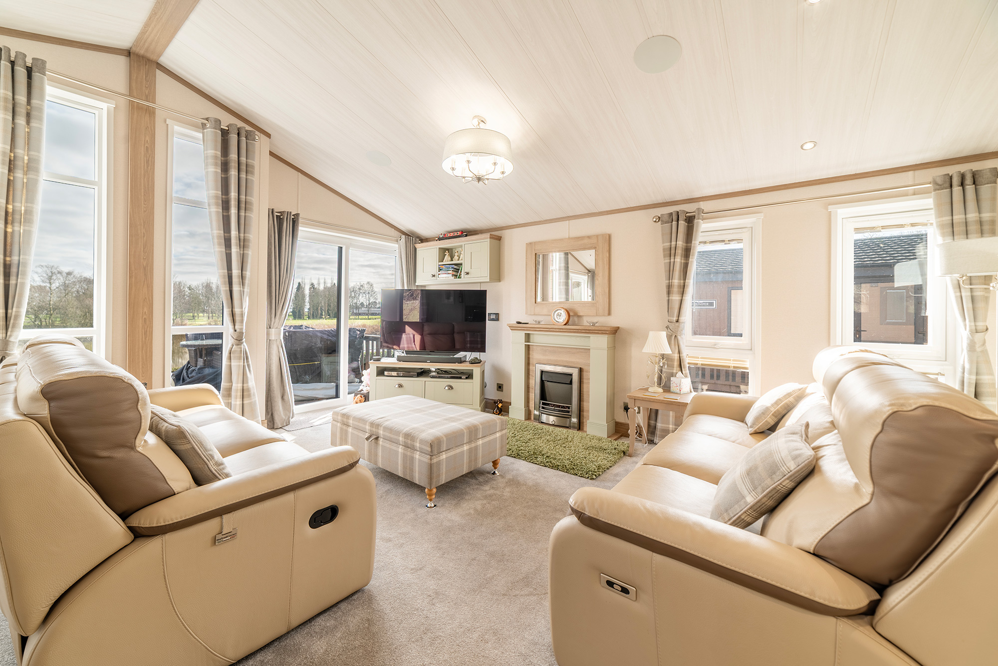 Turn left and you’re into the stunning open plan living space. This is a twin unit so there are 2 sets of sliding patio doors divided by 2 feature floor to ceiling windows bringing in ample light. The view is the real winner here. Overlooking Park Pool, there’s a huge glass fronted deck with bags of room for plenty of patio furniture. On warm, summer evenings you won’t want to budge!