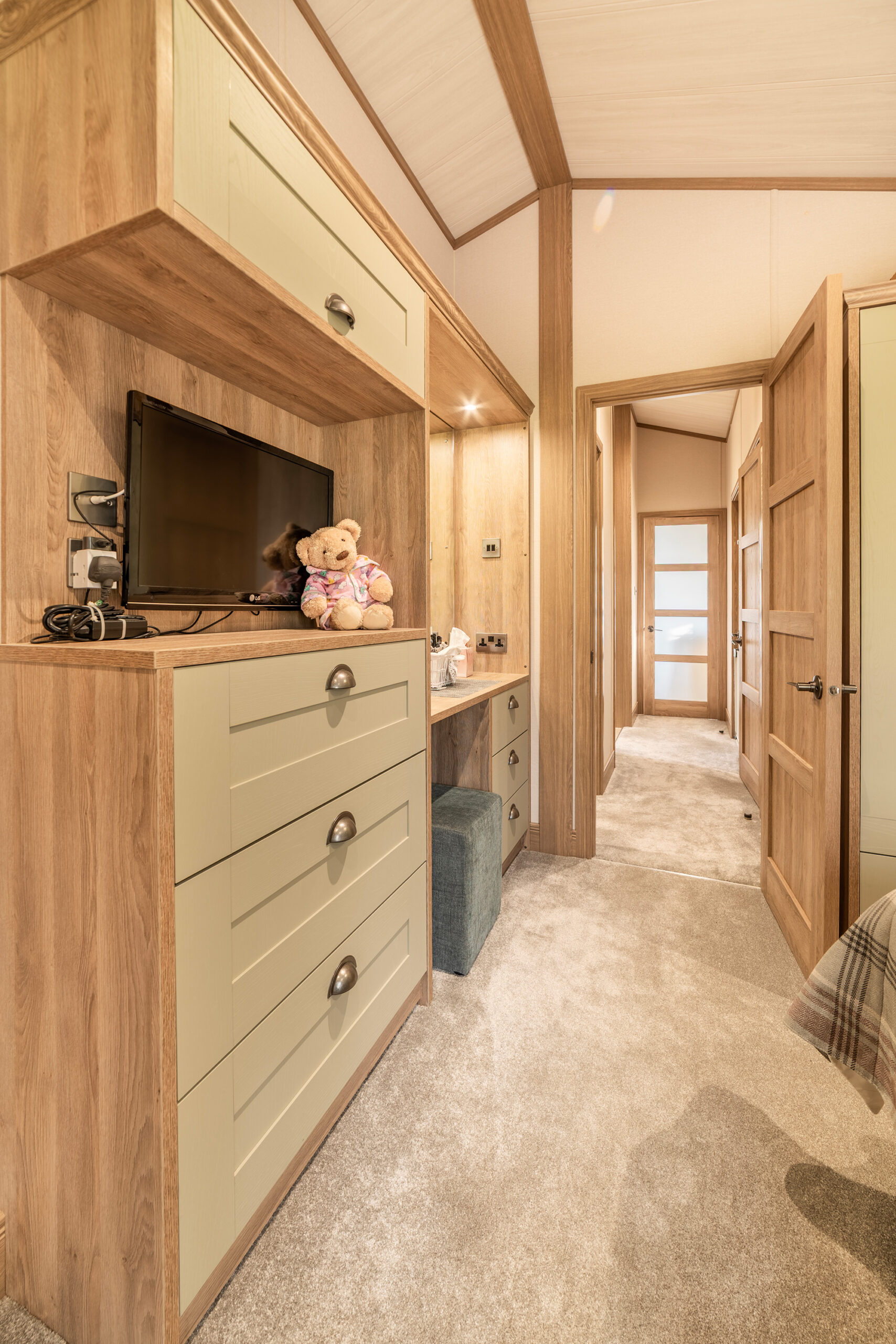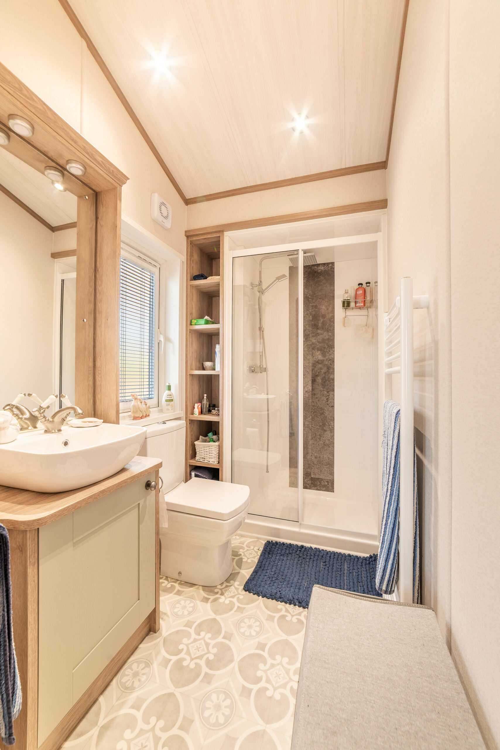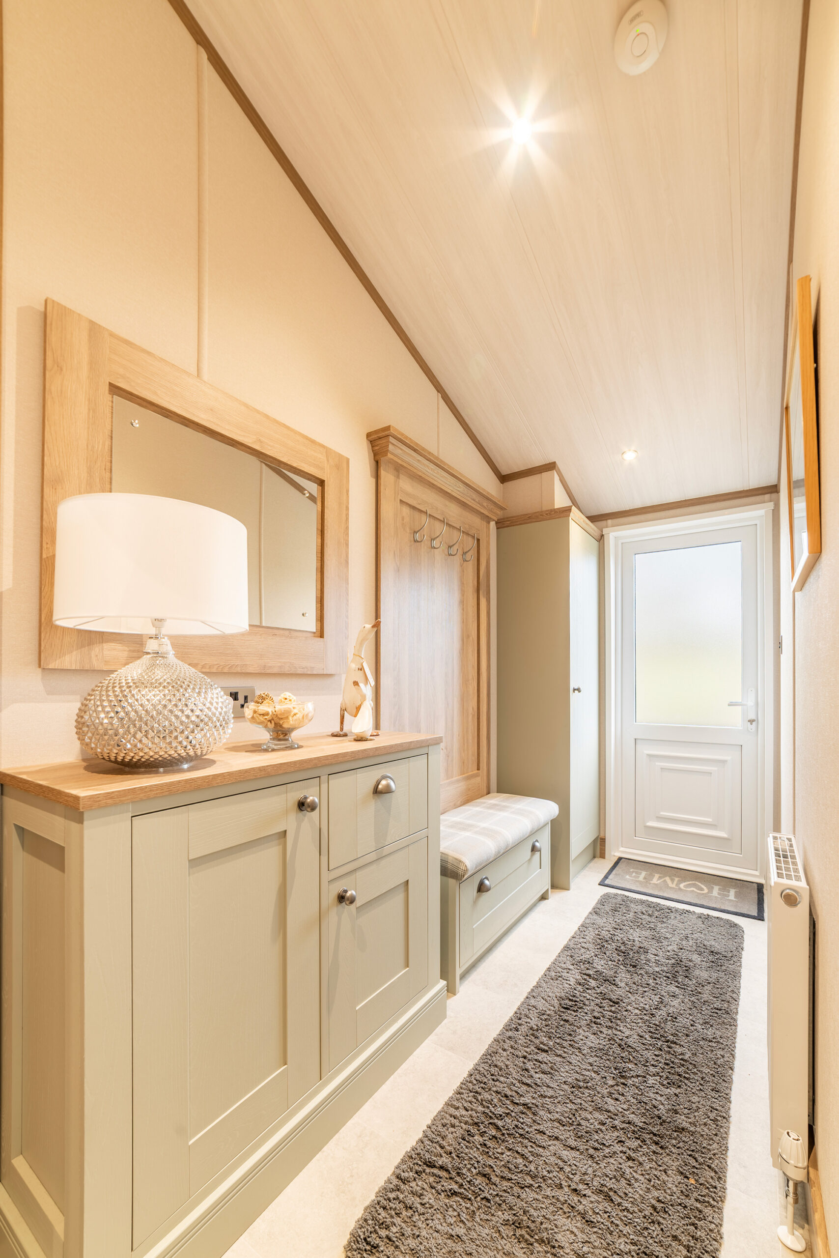 So, back to that hallway, which you come into via the obscured side entrance door off the decking. This gives you an idea of what’s to come. There’s a cottage feel to the Harrogate with a modern twist. The hallway has a large, fitted seat with storage under and coat hooks above. There’s a drawer unit with plenty of storage and a full-length cupboard for the hoover and ironing board, etc. We can’t stress too much…..a hallway like this is a very rare find.