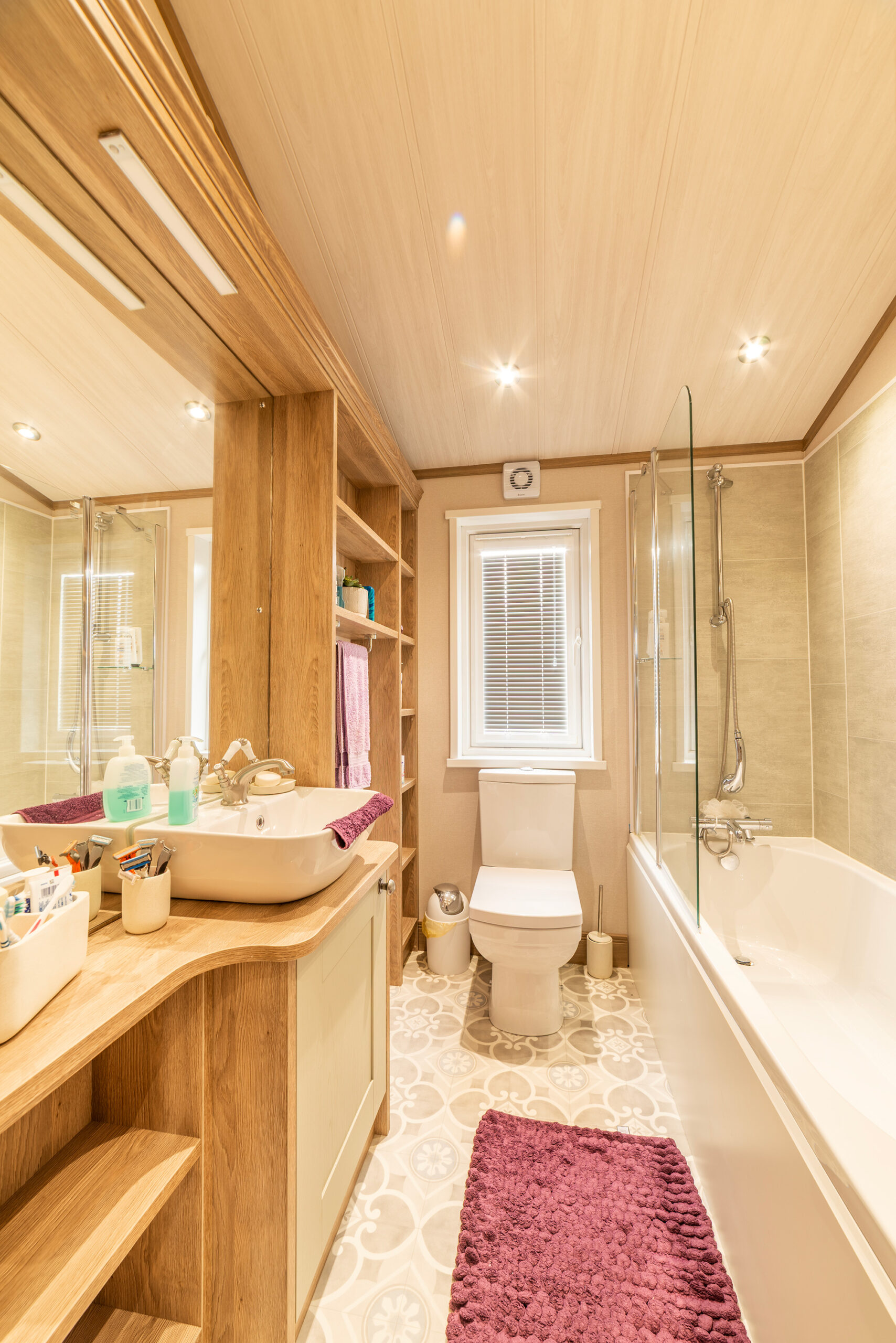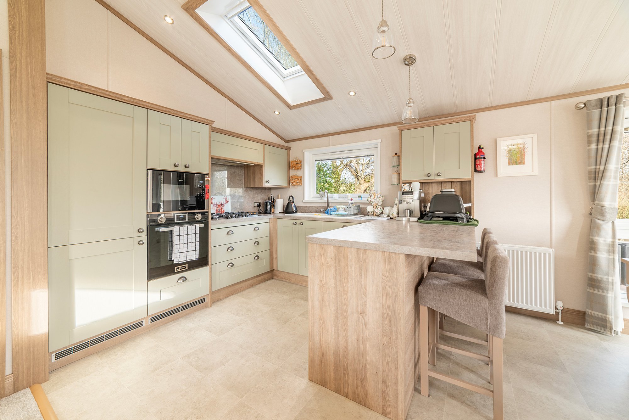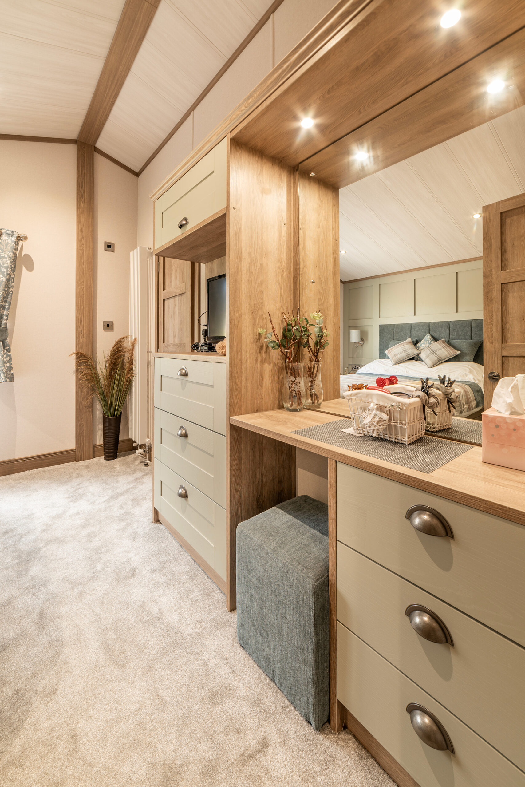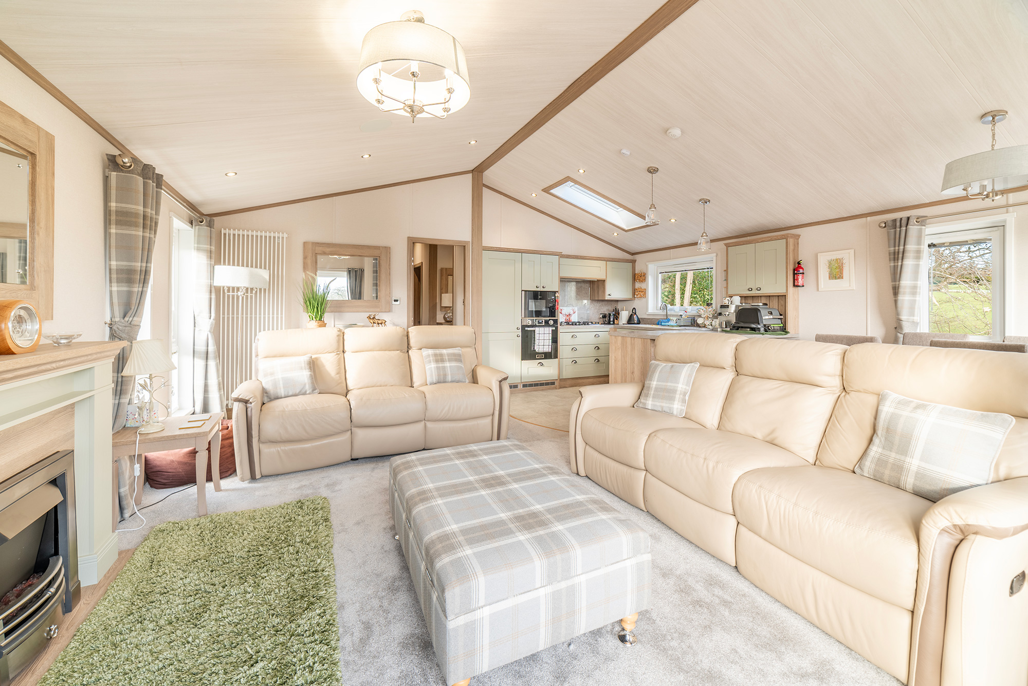So, back to that hallway, which you come into via the obscured side entrance door off the decking. This gives you an idea of what’s to come. There’s a cottage feel to the Harrogate with a modern twist. The hallway has a large, fitted seat with storage under and coat hooks above. There’s a drawer unit with plenty of storage and a full-length cupboard for the hoover and ironing board, etc. We can’t stress too much…..a hallway like this is a very rare find.