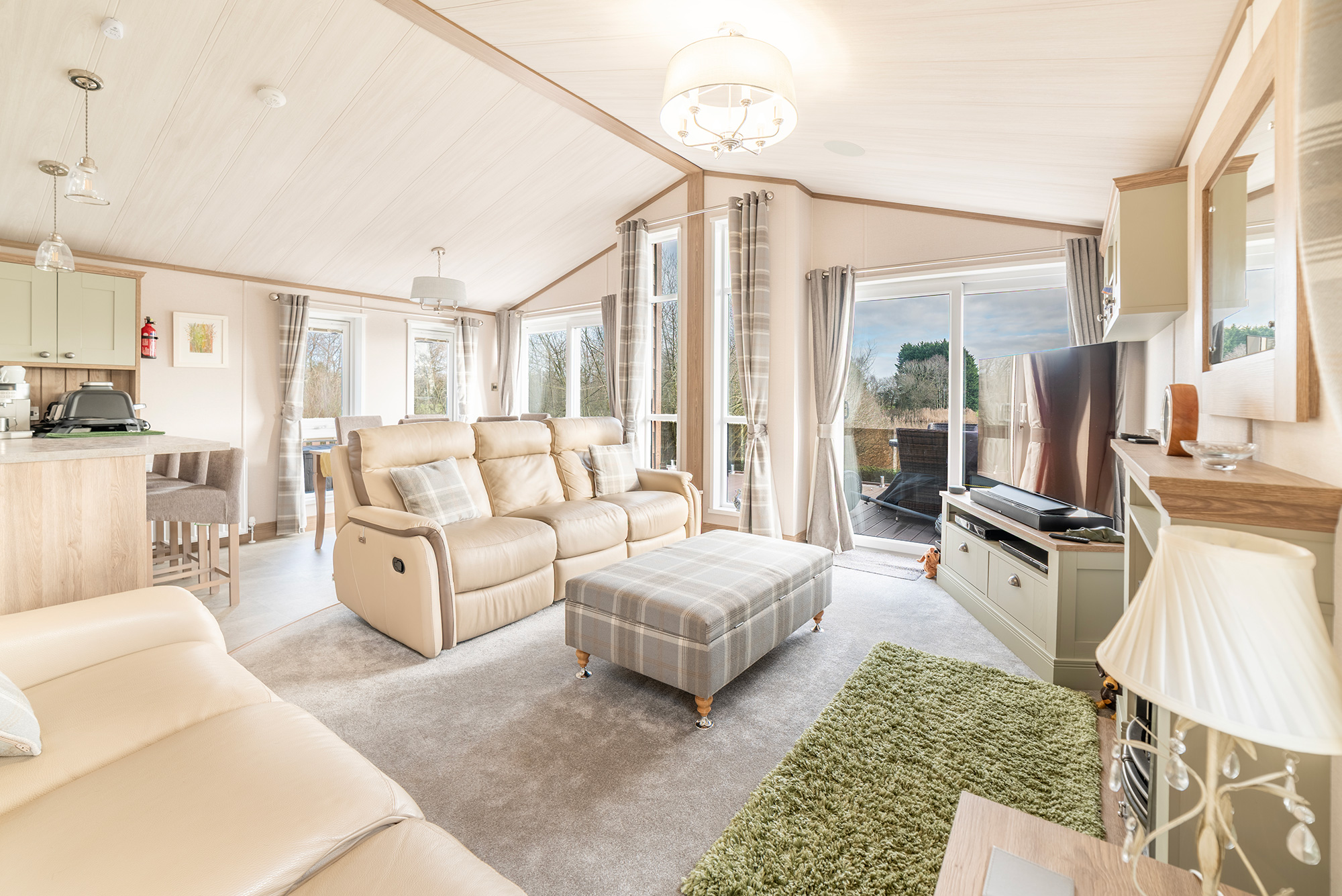 The internal living space is cleverly divided to make the most of the openess and the views. The dining table is set in front of one of the sets of patio doors and can comfortably seat 6. There are 2, large 3-seater leather sofas with recliner seats around a focal fireplace. The cool, light check accessories perfectly complement the olive green cupboard fronts throughout the home.