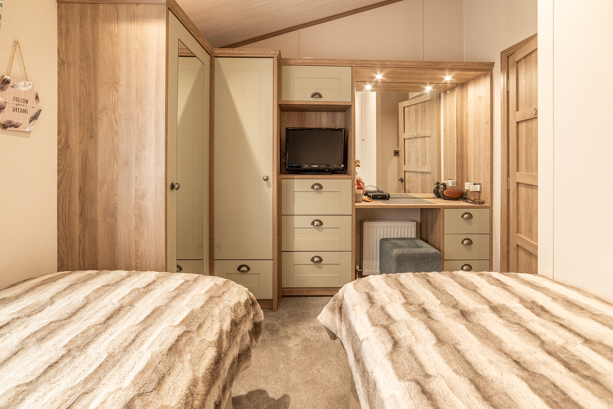 The bedrooms are at the far end of the home. The generous twin-bedded room has feature wall paneling, a wardrobe and dressing table and access to the main bathroom opposite. For a 2nd bedroom this is big with plenty of storage.