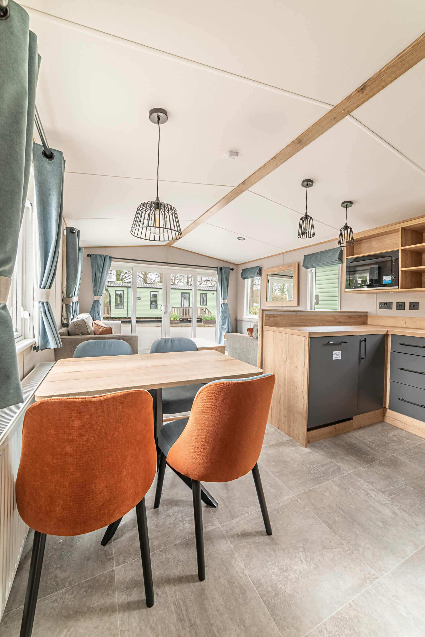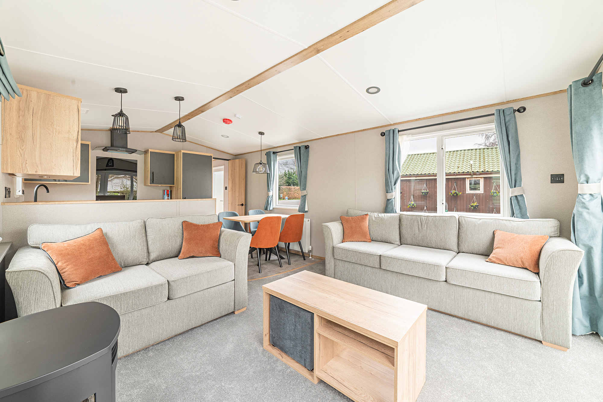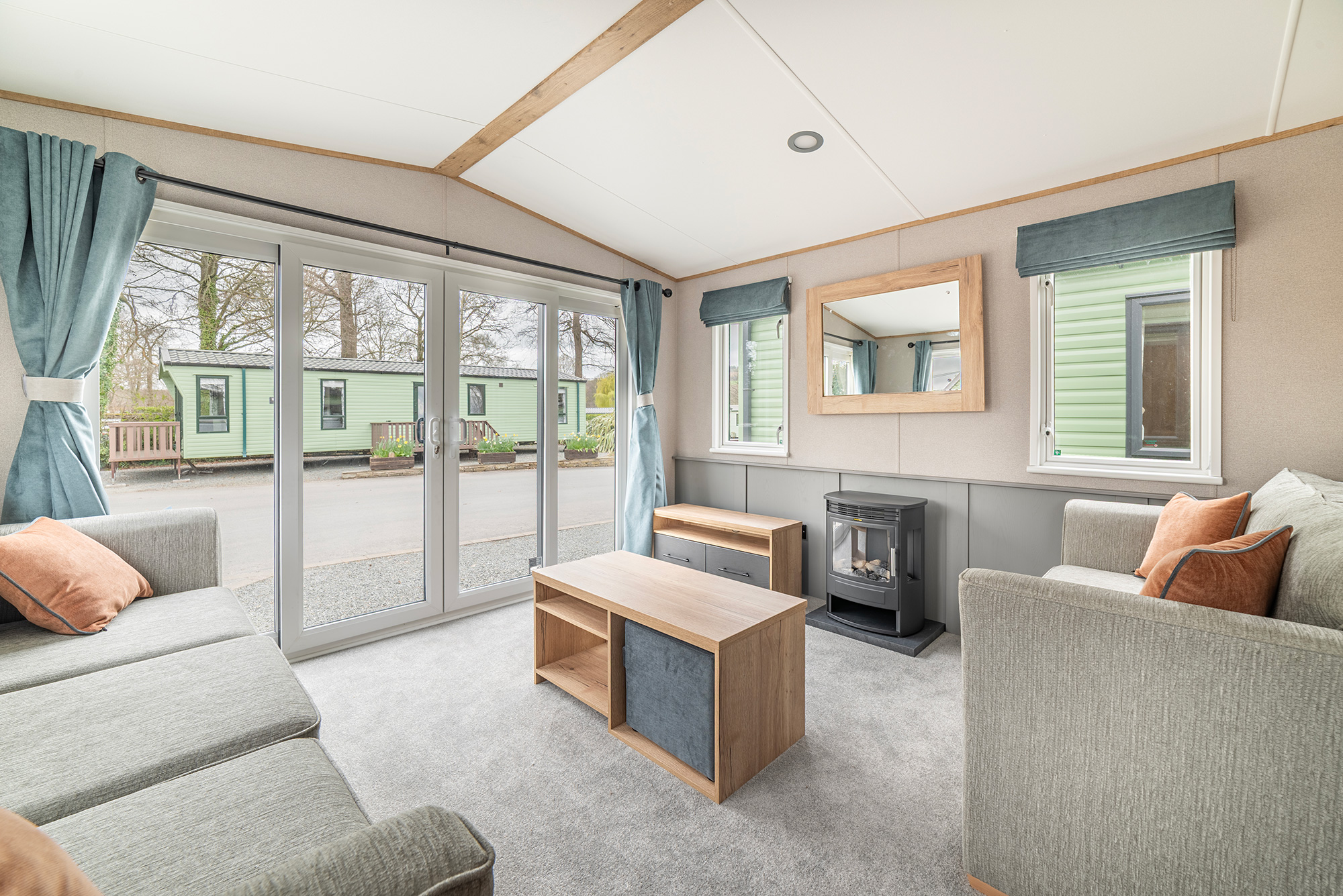 The lounge is light and airy due to the glass front which includes sliding patio doors and triple aspect windows. There’s a 3-seater sofa which converts to a sofa bed to accommodate guests as well as a 2-seater sofa. The coffee table has 2 stools under for extra seating. The focal point is a freestanding electric wood stove-effect fire.