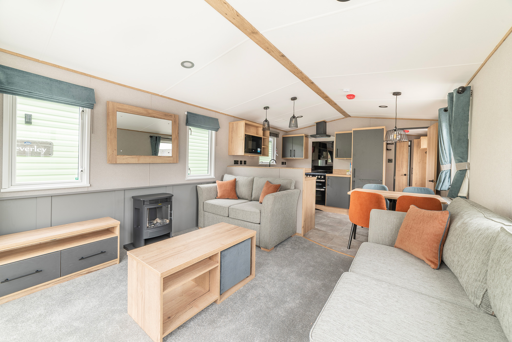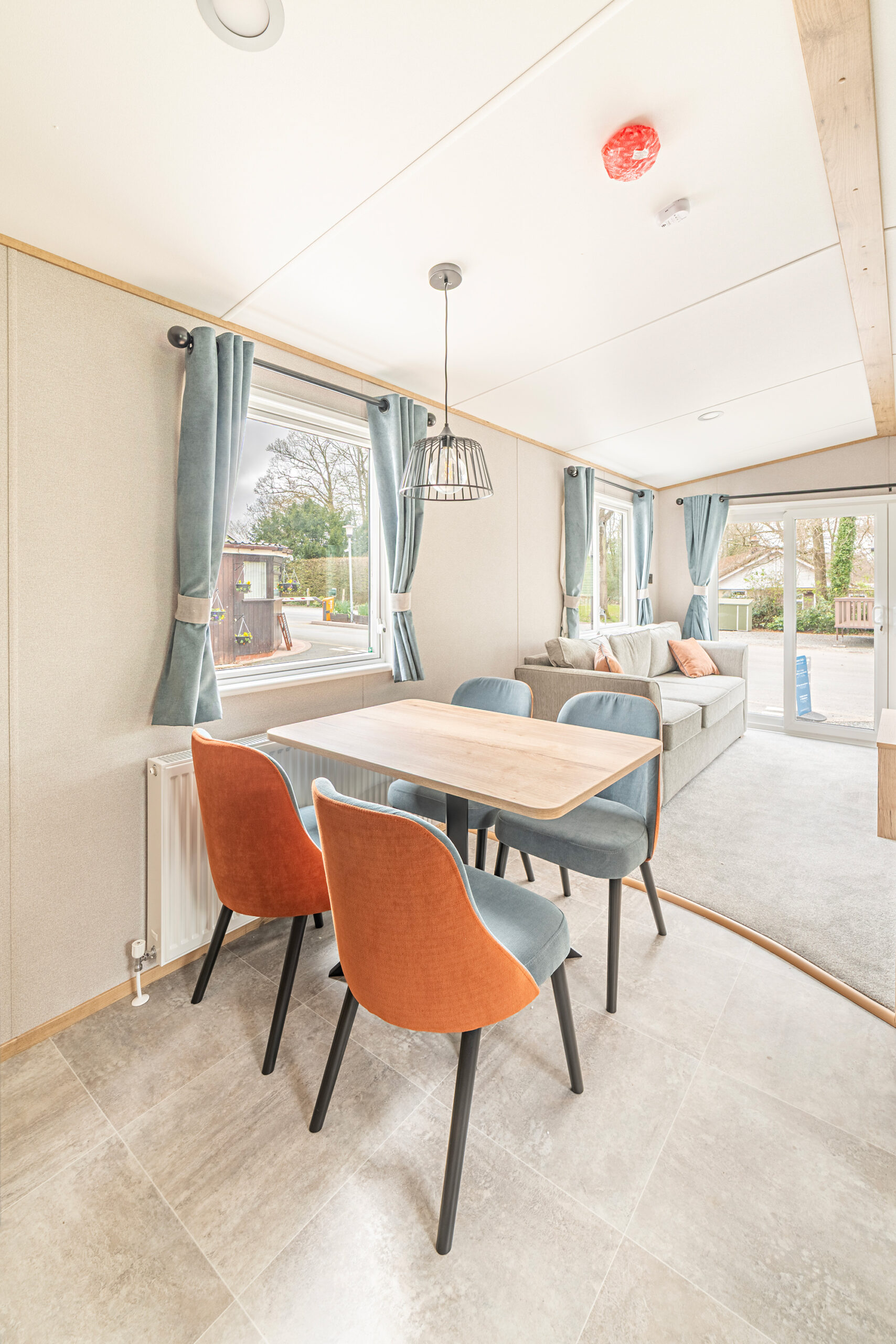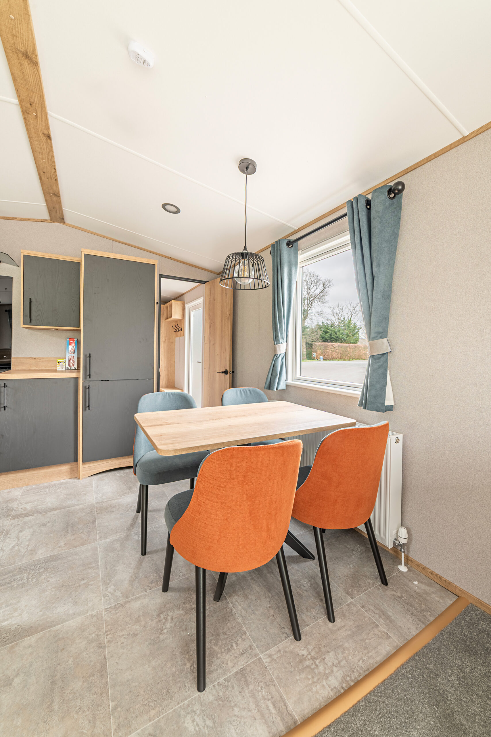 The lounge is light and airy due to the glass front which includes sliding patio doors and triple aspect windows. There’s a 3-seater sofa which converts to a sofa bed to accommodate guests as well as a 2-seater sofa. The coffee table has 2 stools under for extra seating. The focal point is a freestanding electric wood stove-effect fire.