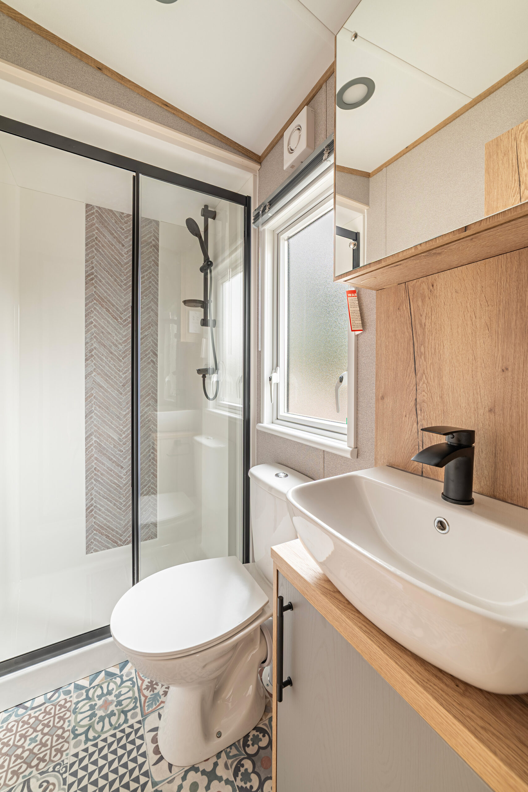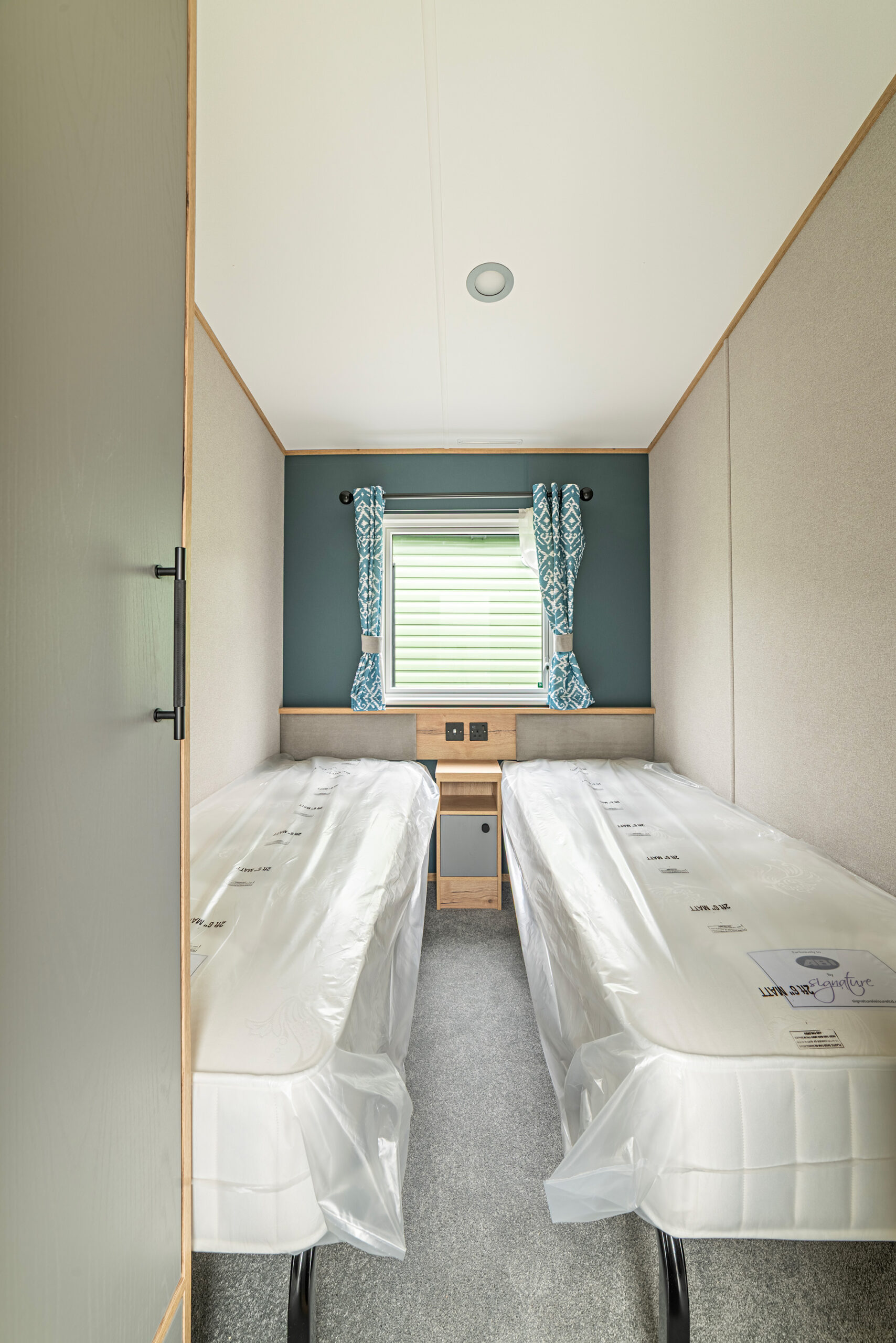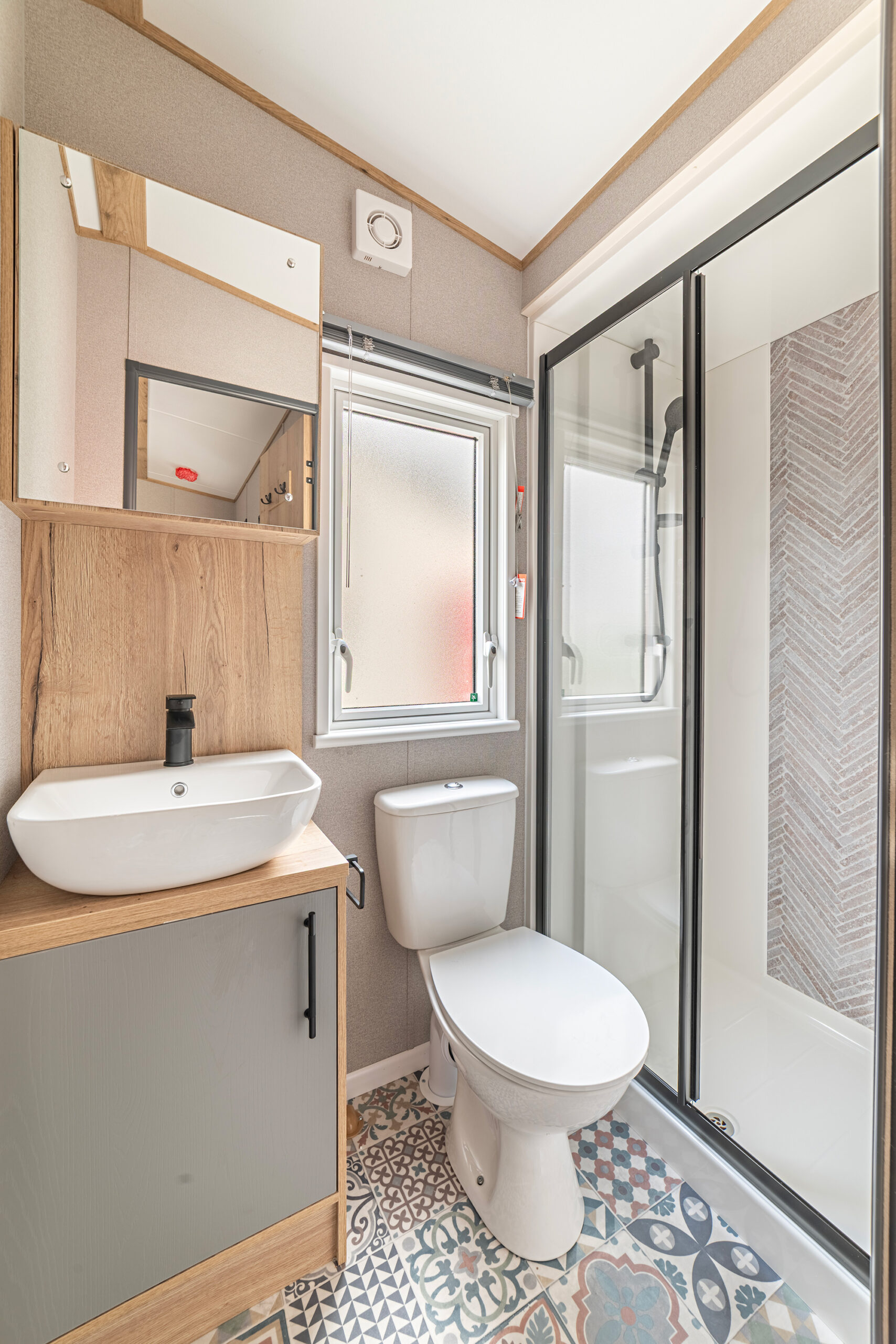 Back through the kitchen and the hallway you’ll find two bedrooms and two bathrooms. The twin room has a wardrobe with drawers, and a shelf and mirror. There are bedside USB charging points too. All the beds in the St David have ABI pocket sprung mattresses. This bedroom is served by a spacious family shower room. This has a double width shower, modern basin and close coupled WC. Nice flooring in here too! There’s also an obscured opening window – we mention opening windows in bathrooms as they’re a must for some people to dissipate shower steam and keep things fresh!