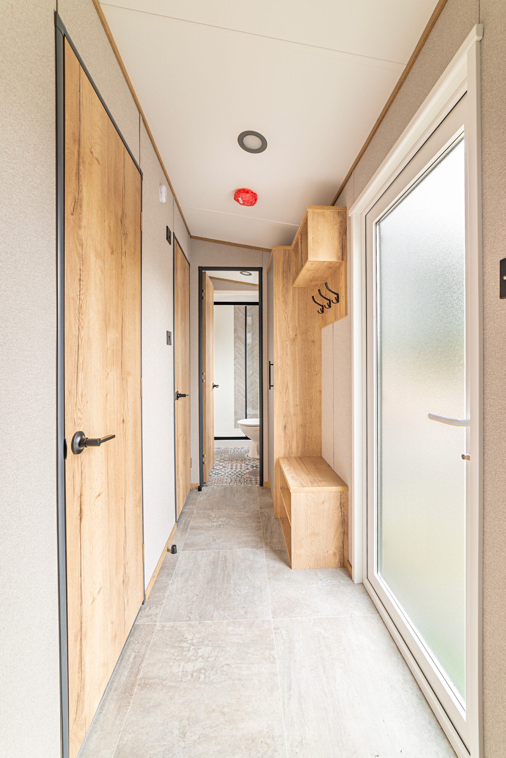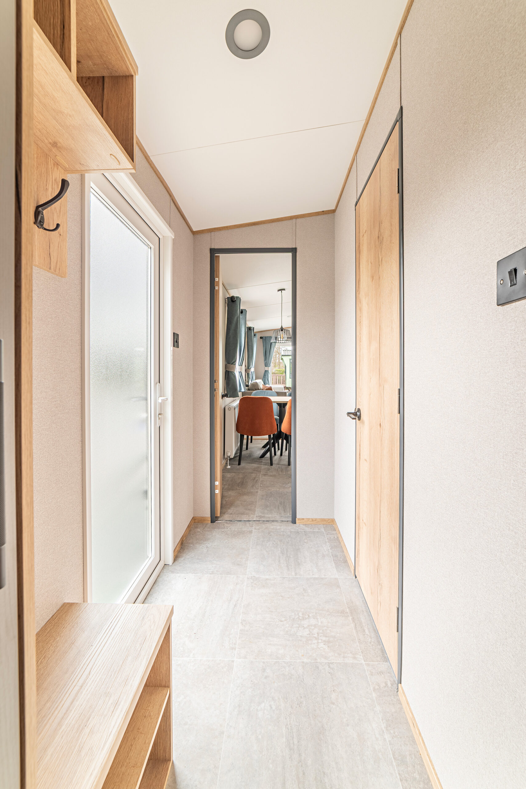You enter the St David through the obscured side door, straight into…ta-da!!…a hallway. We love these in a holiday home because they’re so handy! A holding pen for dogs and children with mucky paws and dirty boots. There are hooks for coats, somewhere to sit and take off shoes and storage for them too.