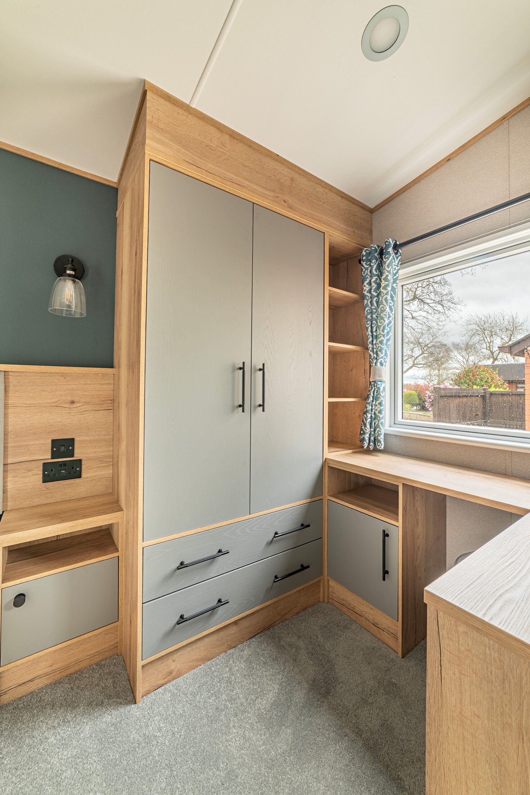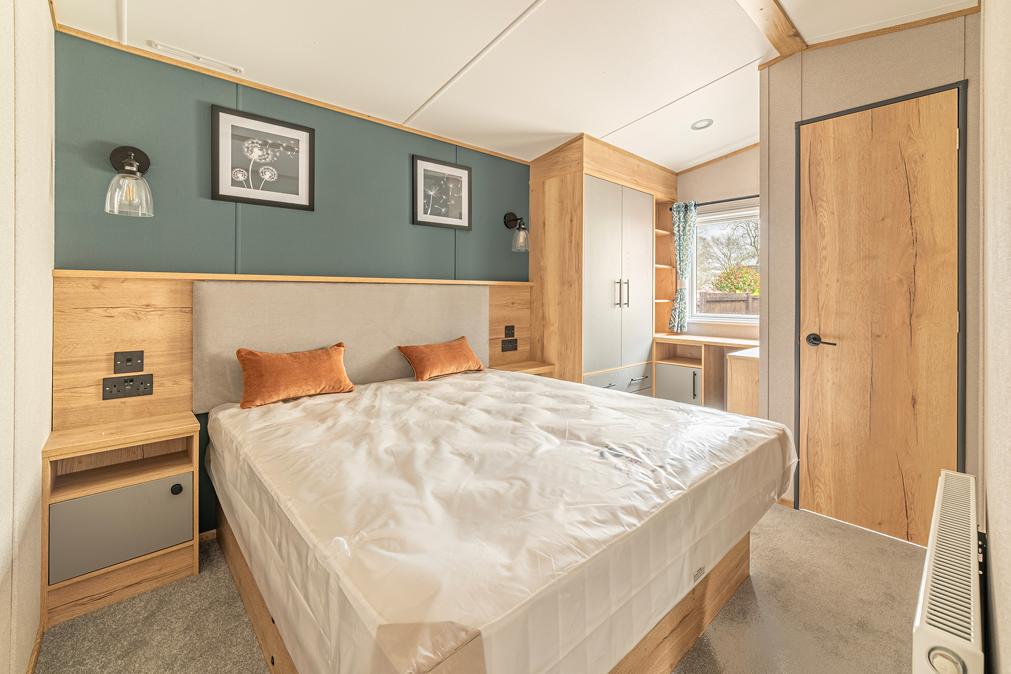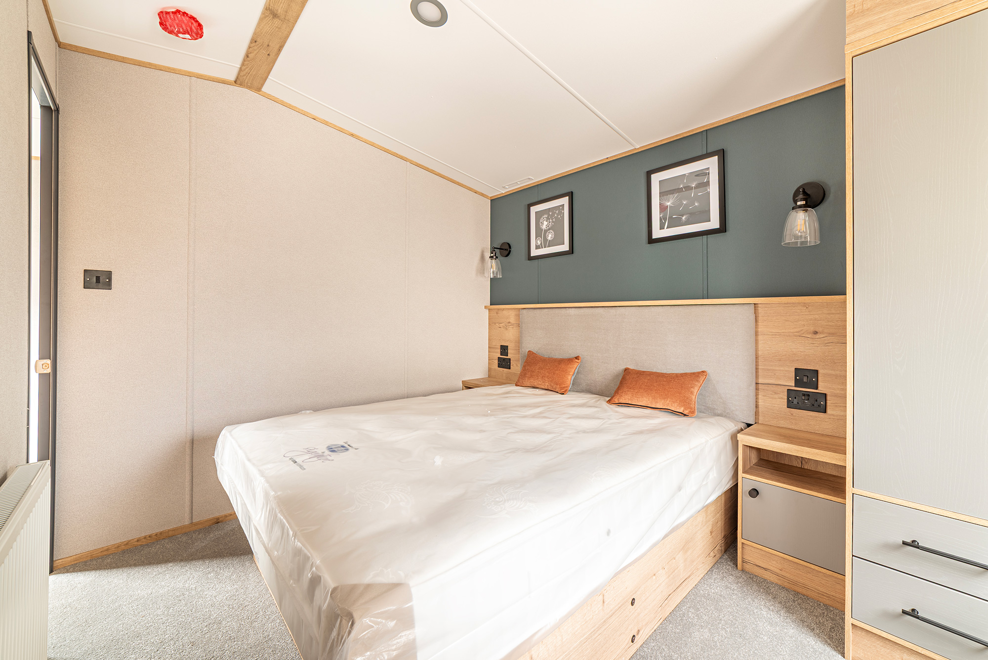 The master bedroom at the far end of the St David is gorgeous! Teal, rust and grey colours give this room a clean, modern feel. The double bed with pocket sprung mattress has storage under, personal lights above both side tables which also have USB charging points as well as standard sockets.