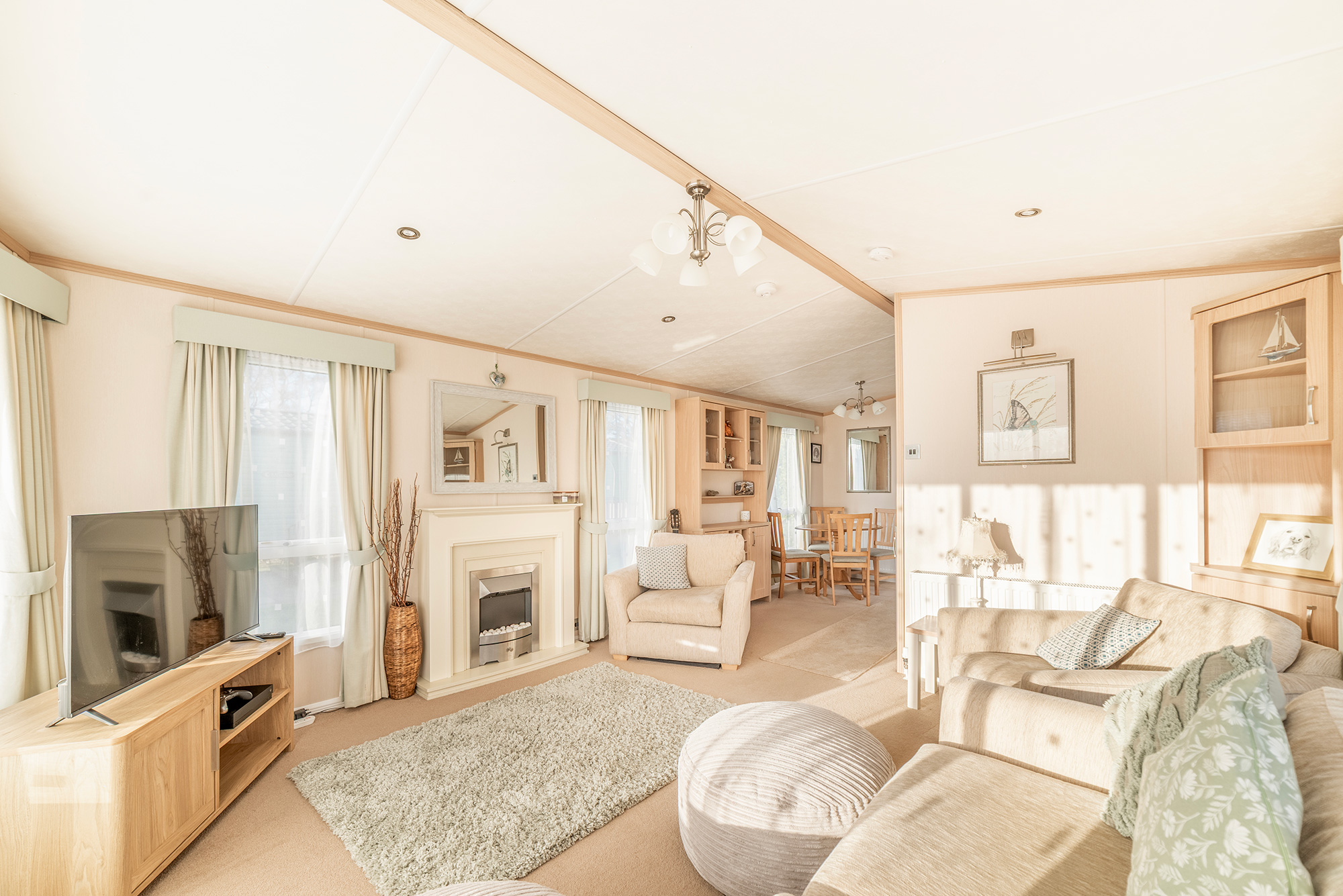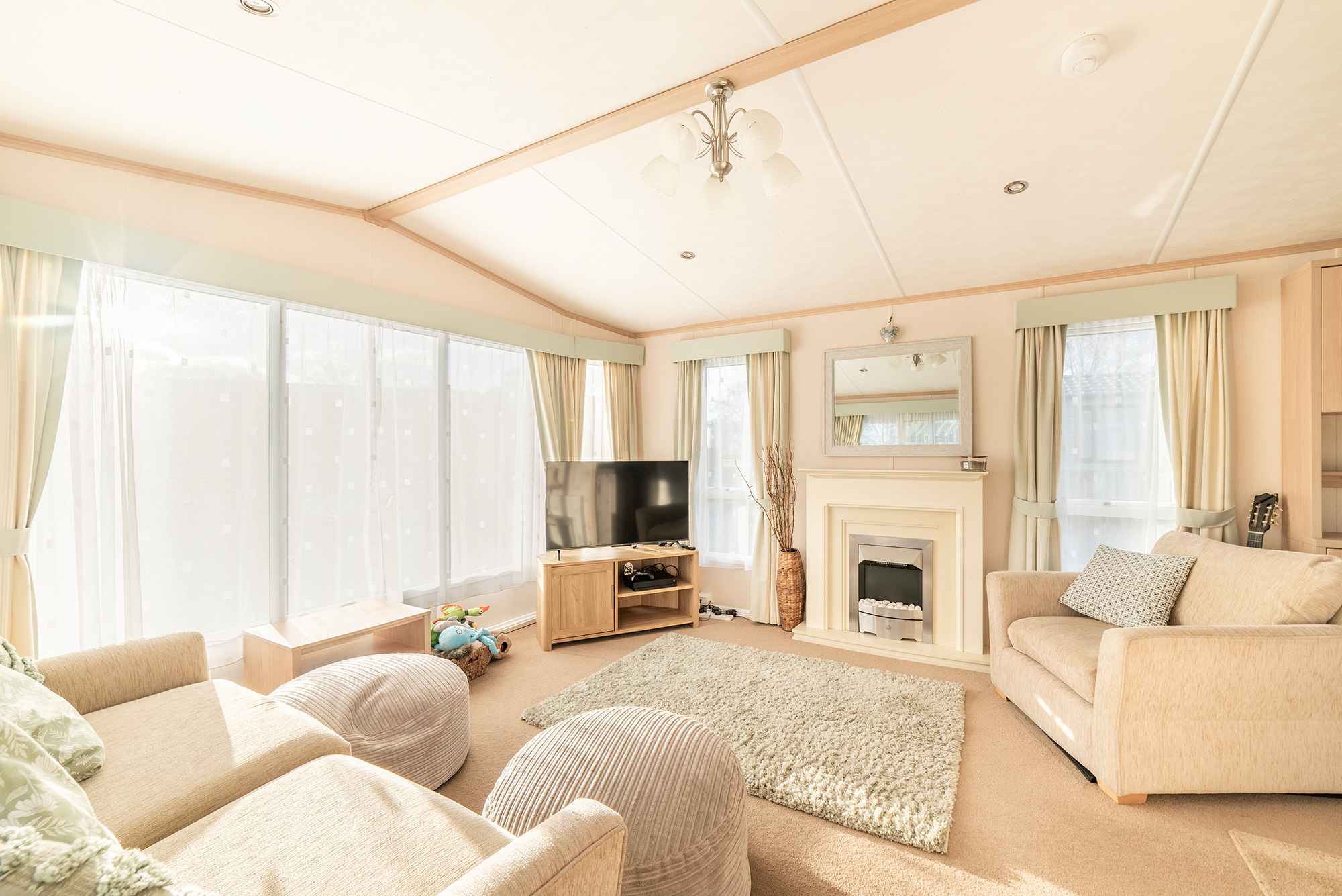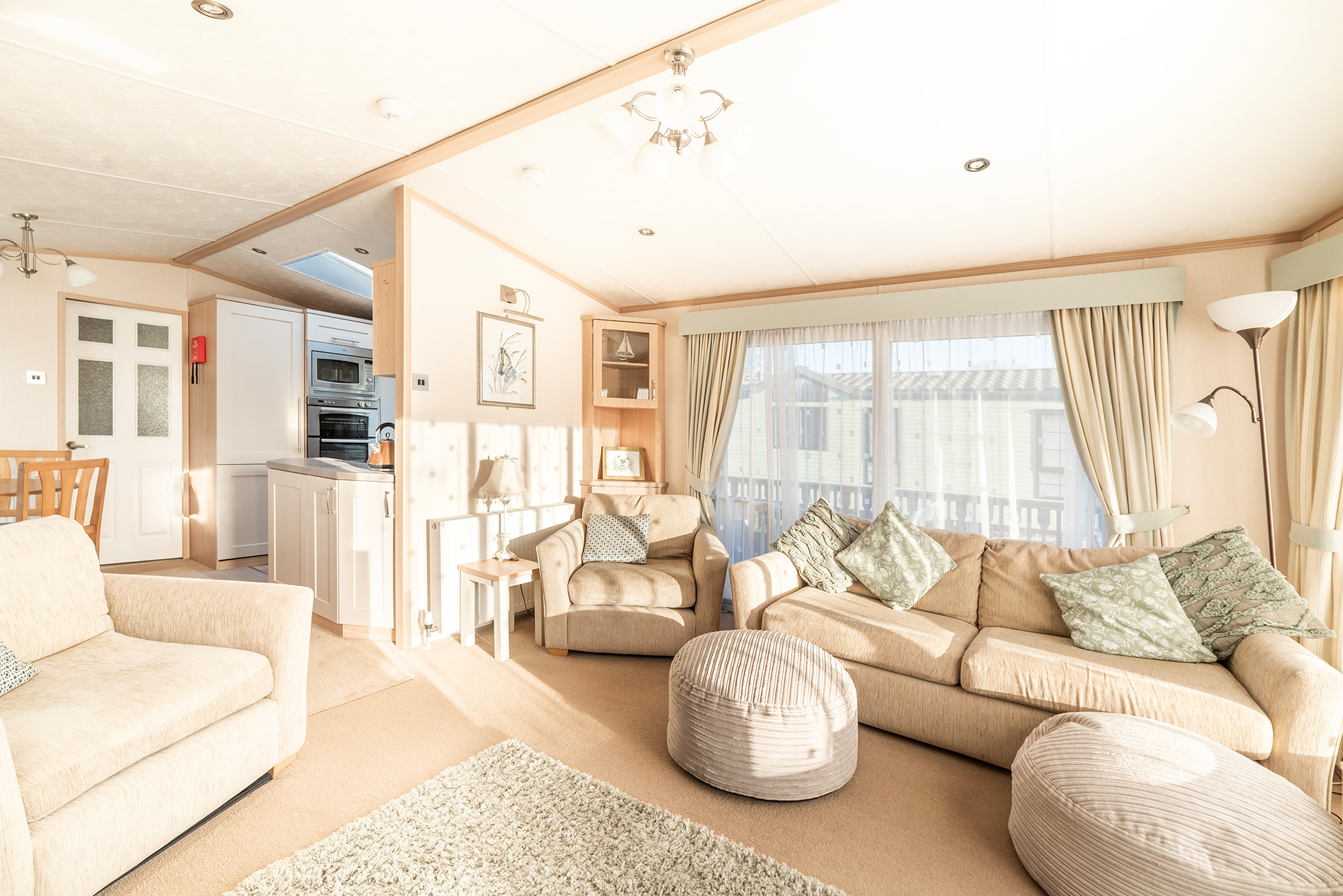 The living area has large, fixed front windows as well as sliding patio doors on the side. This gives great natural light into