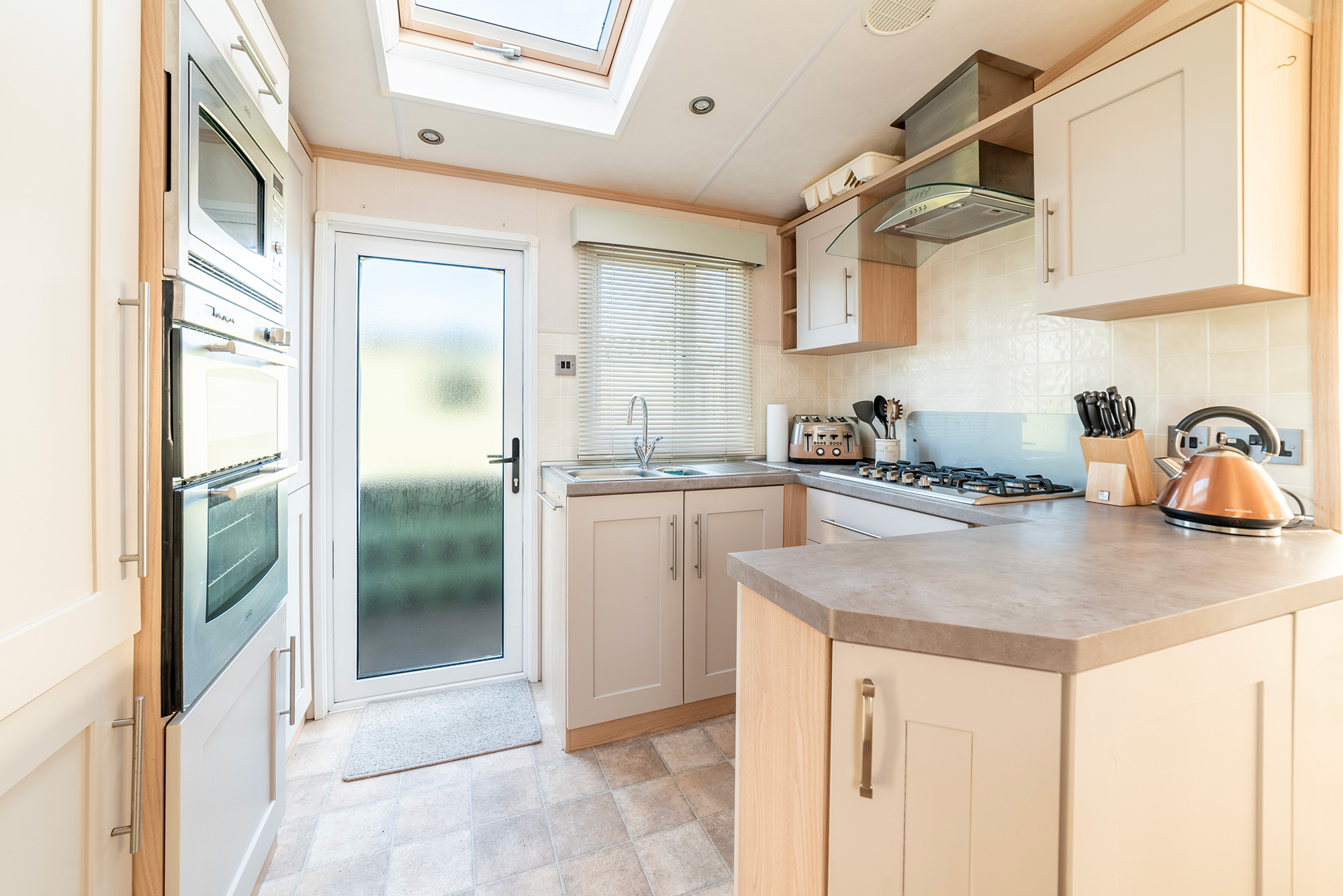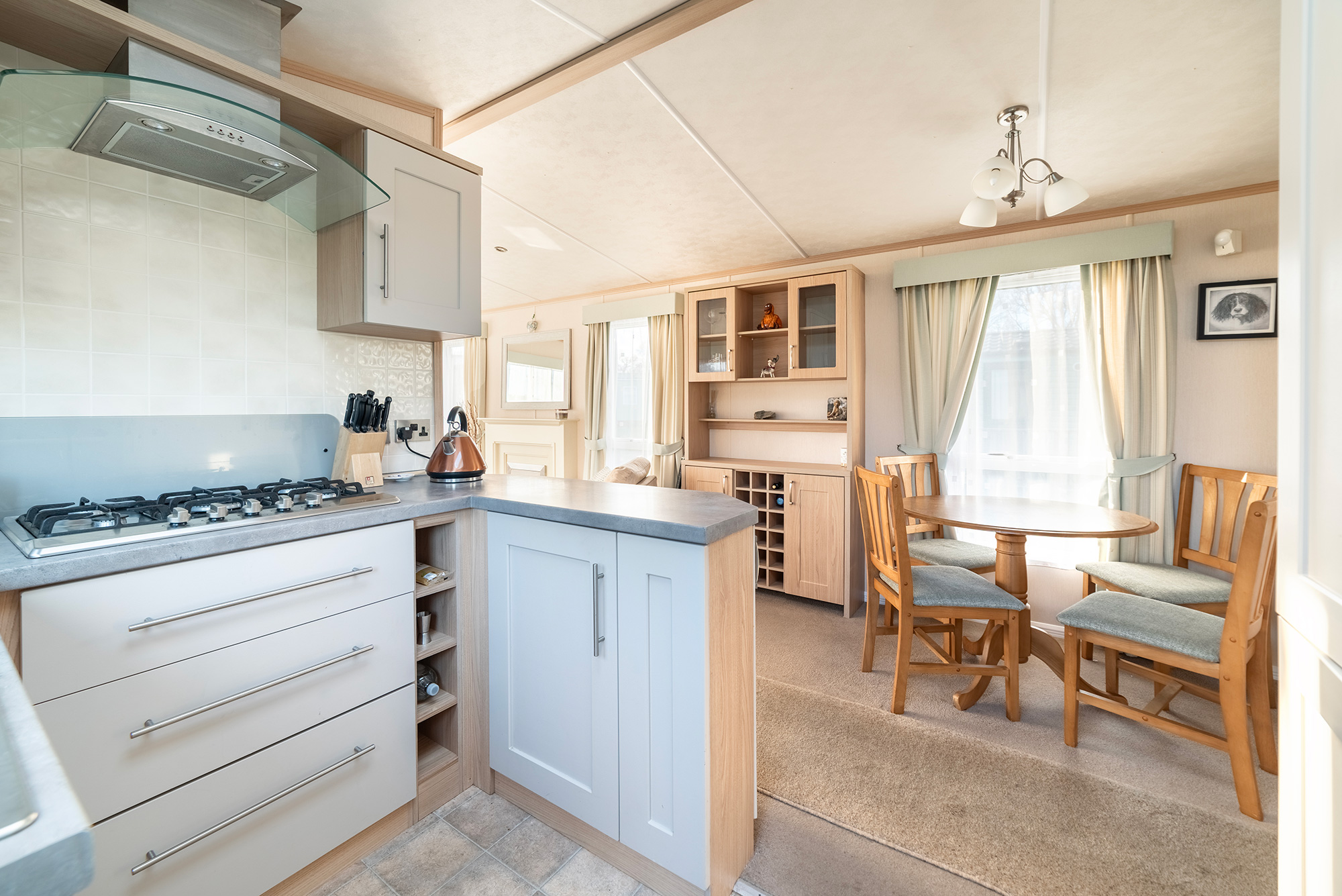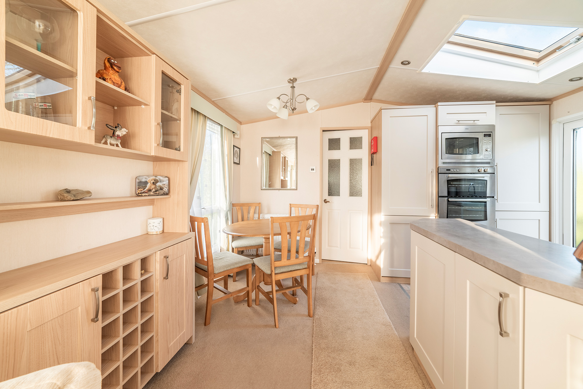 The side entrance door leads you into a kitchen that is part-screened from the living area, which has a dining area for 4