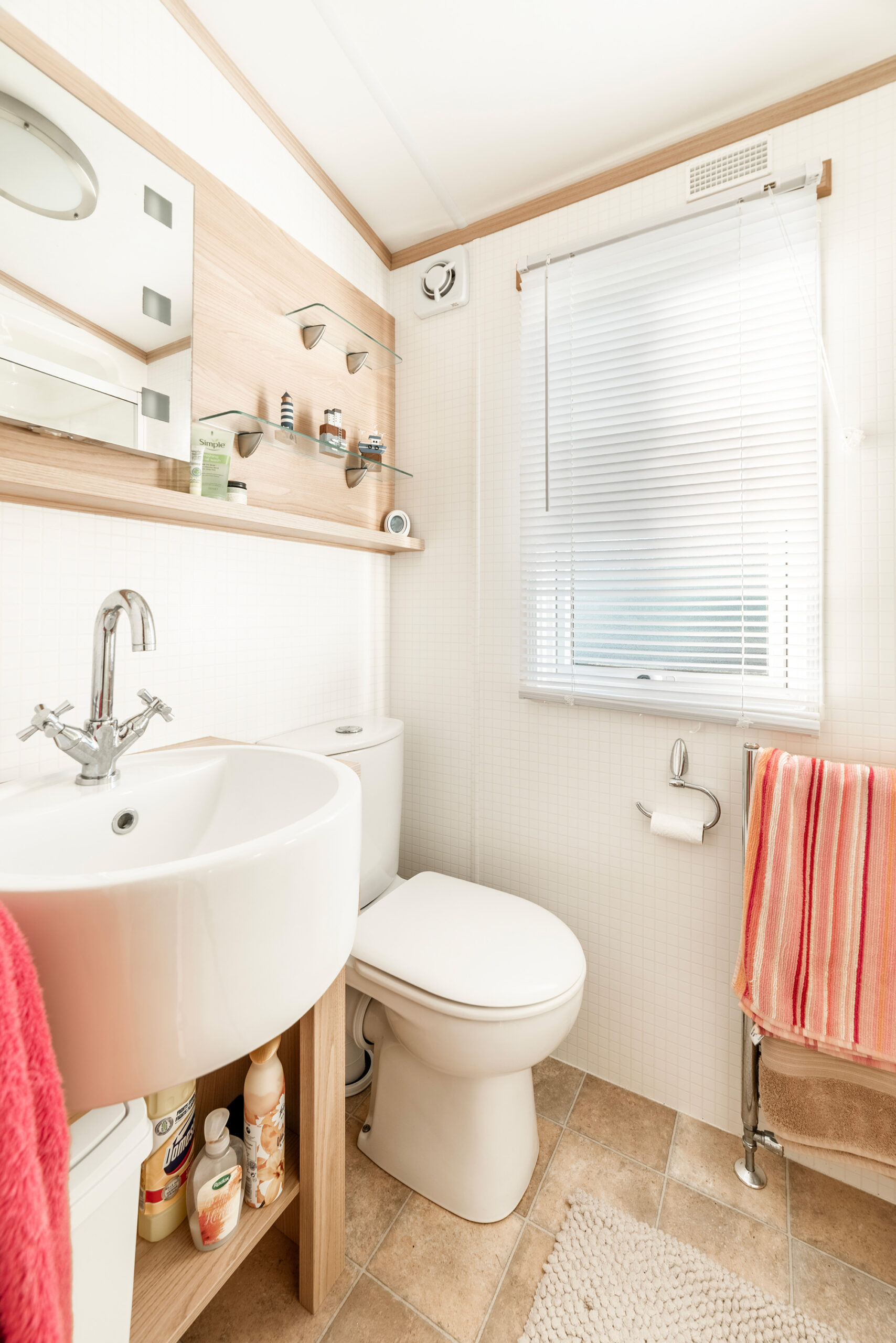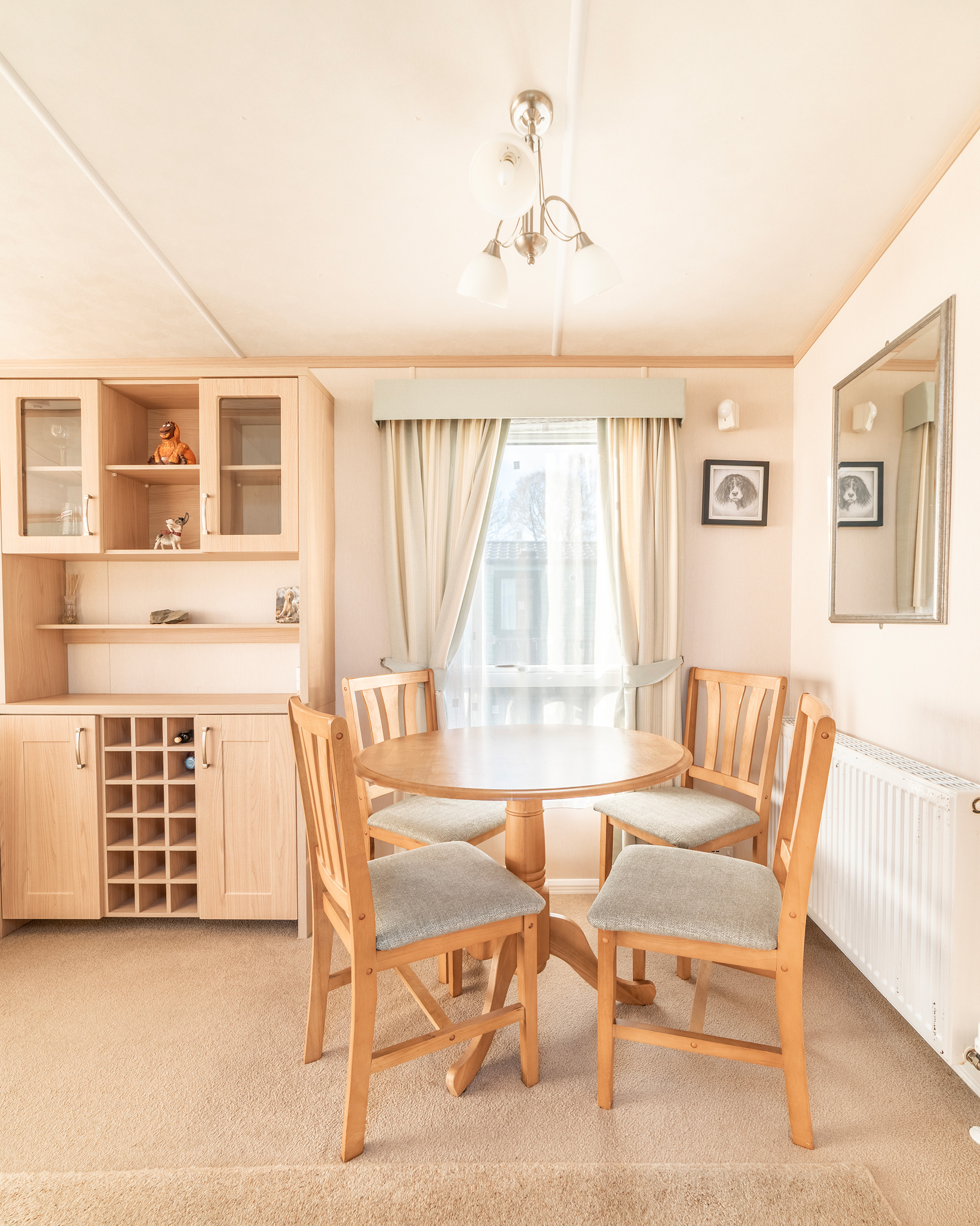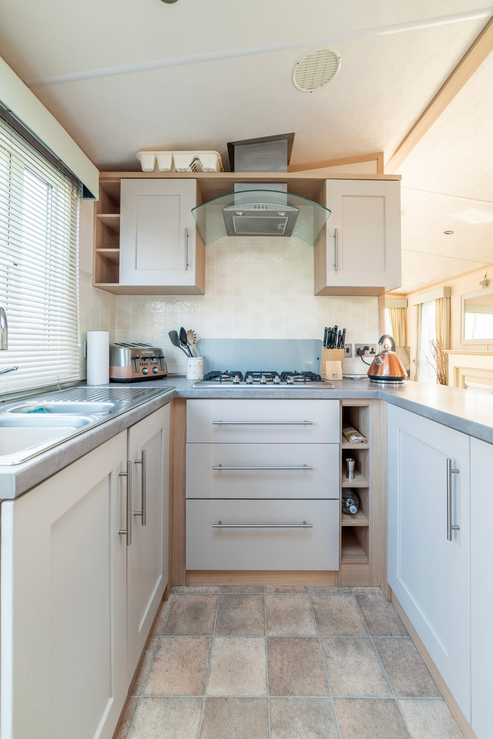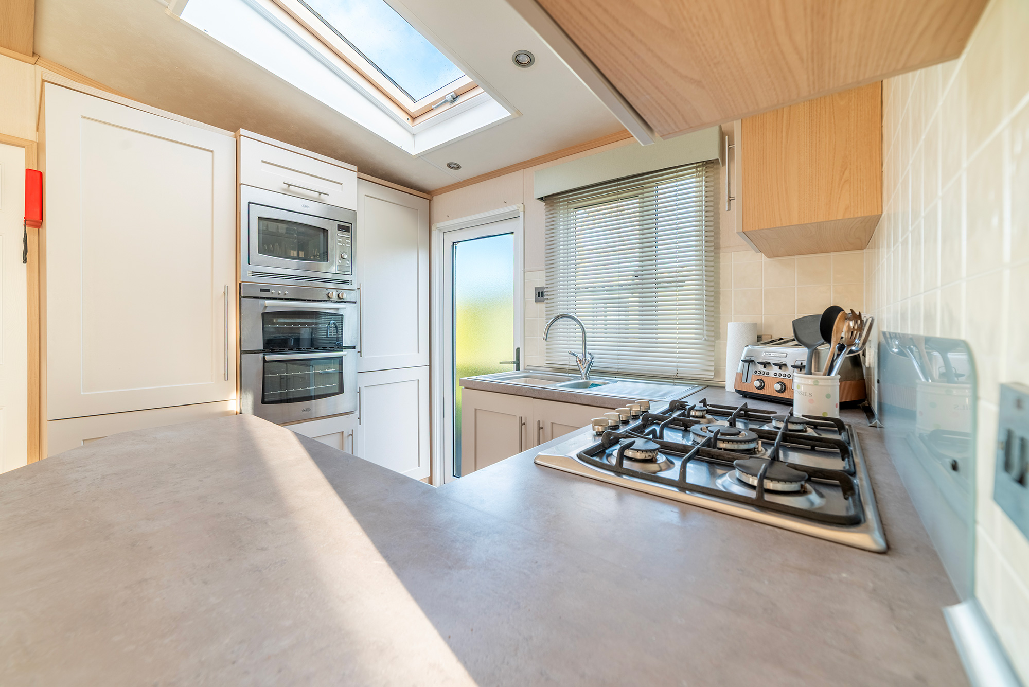 The side entrance door leads you into a kitchen that is part-screened from the living area, which has a dining area for 4