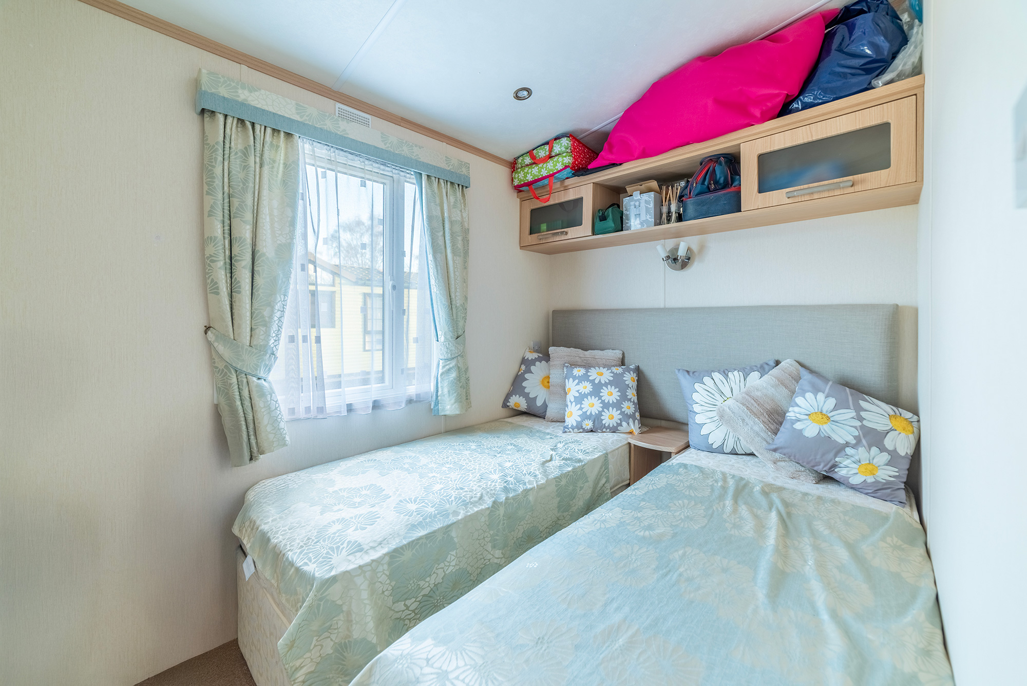 The hallway leads to a family shower room, a twin bedroom for family / guests, and eventually leads to the main bedroom