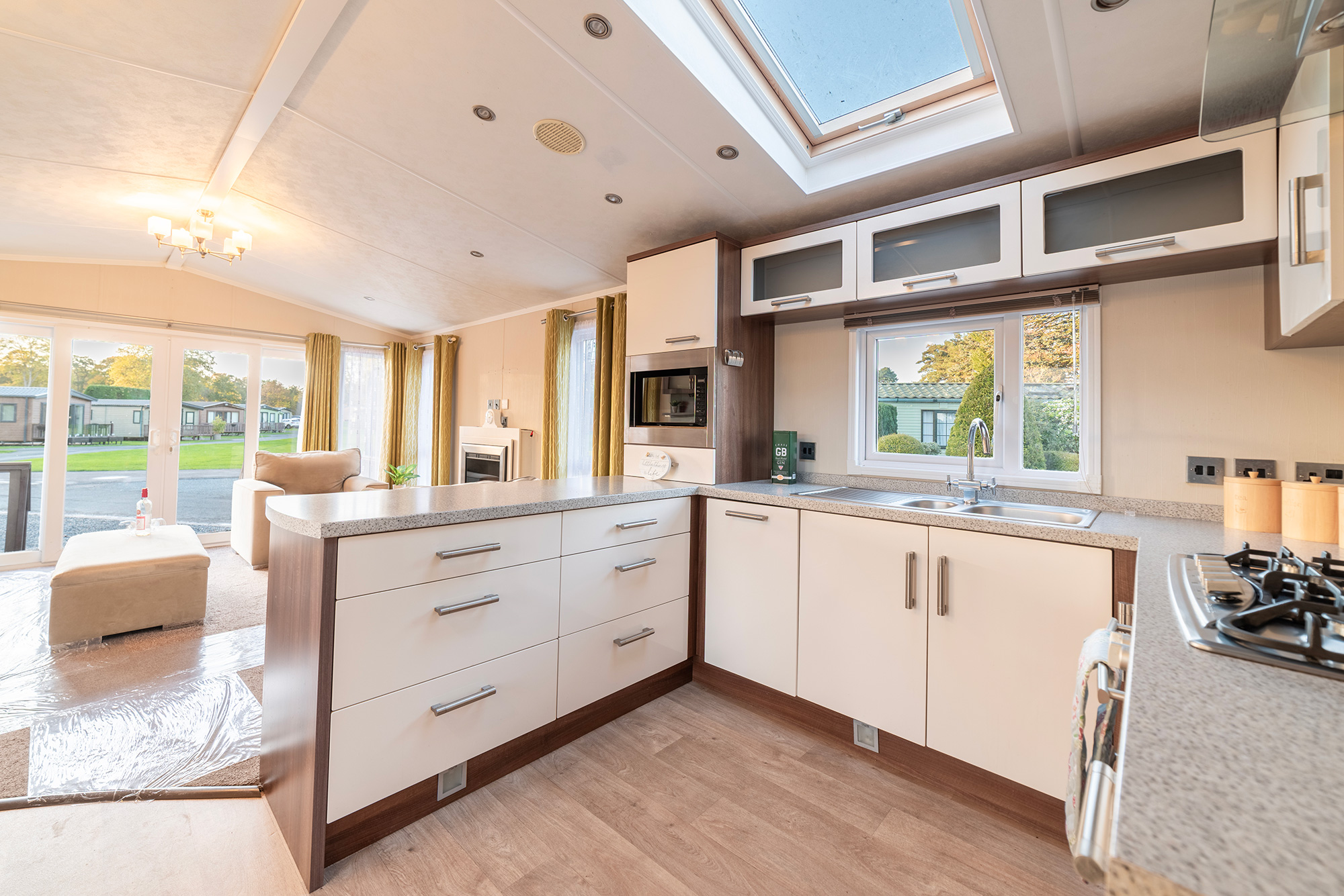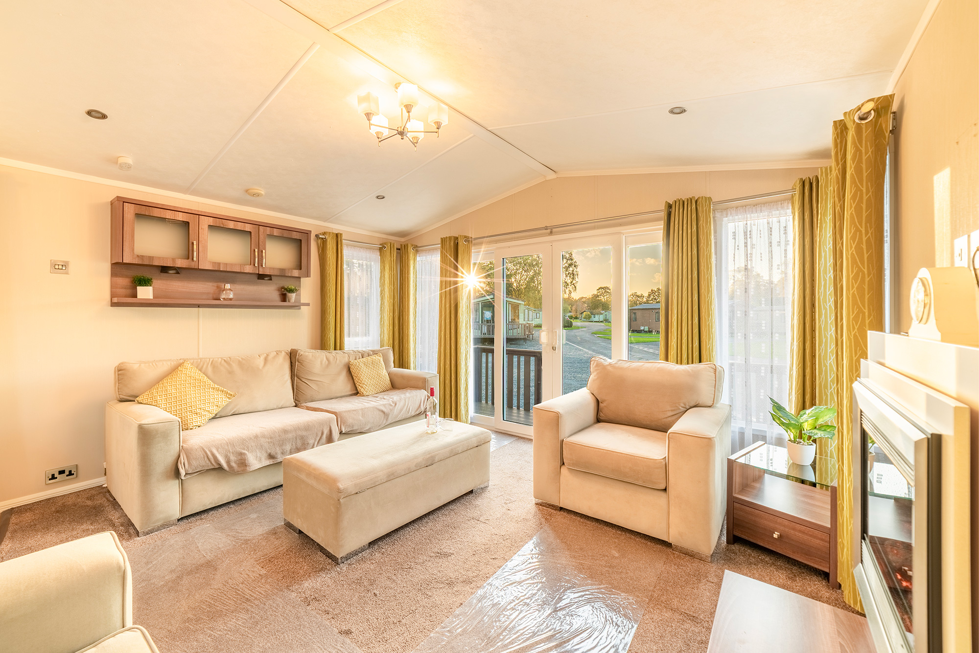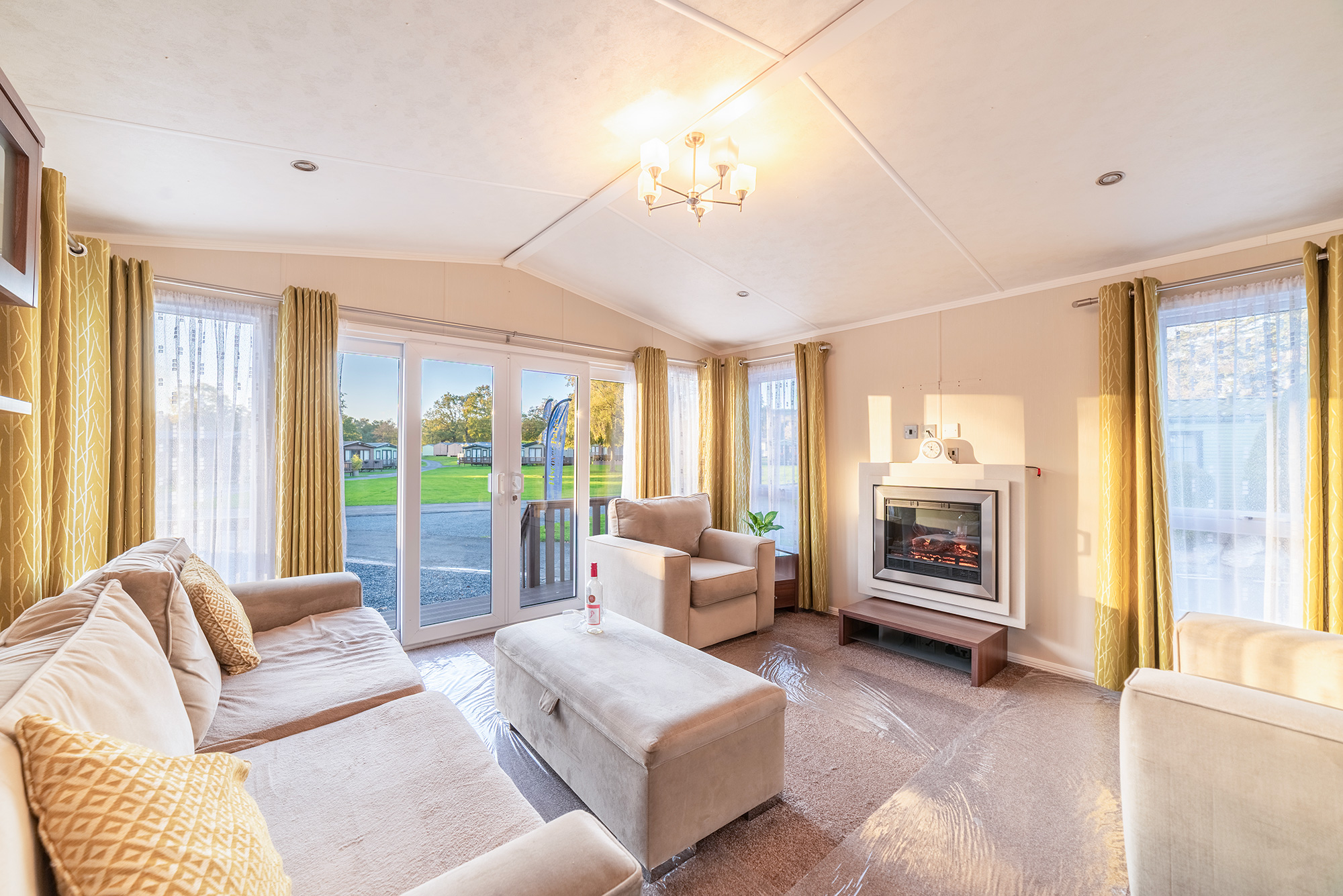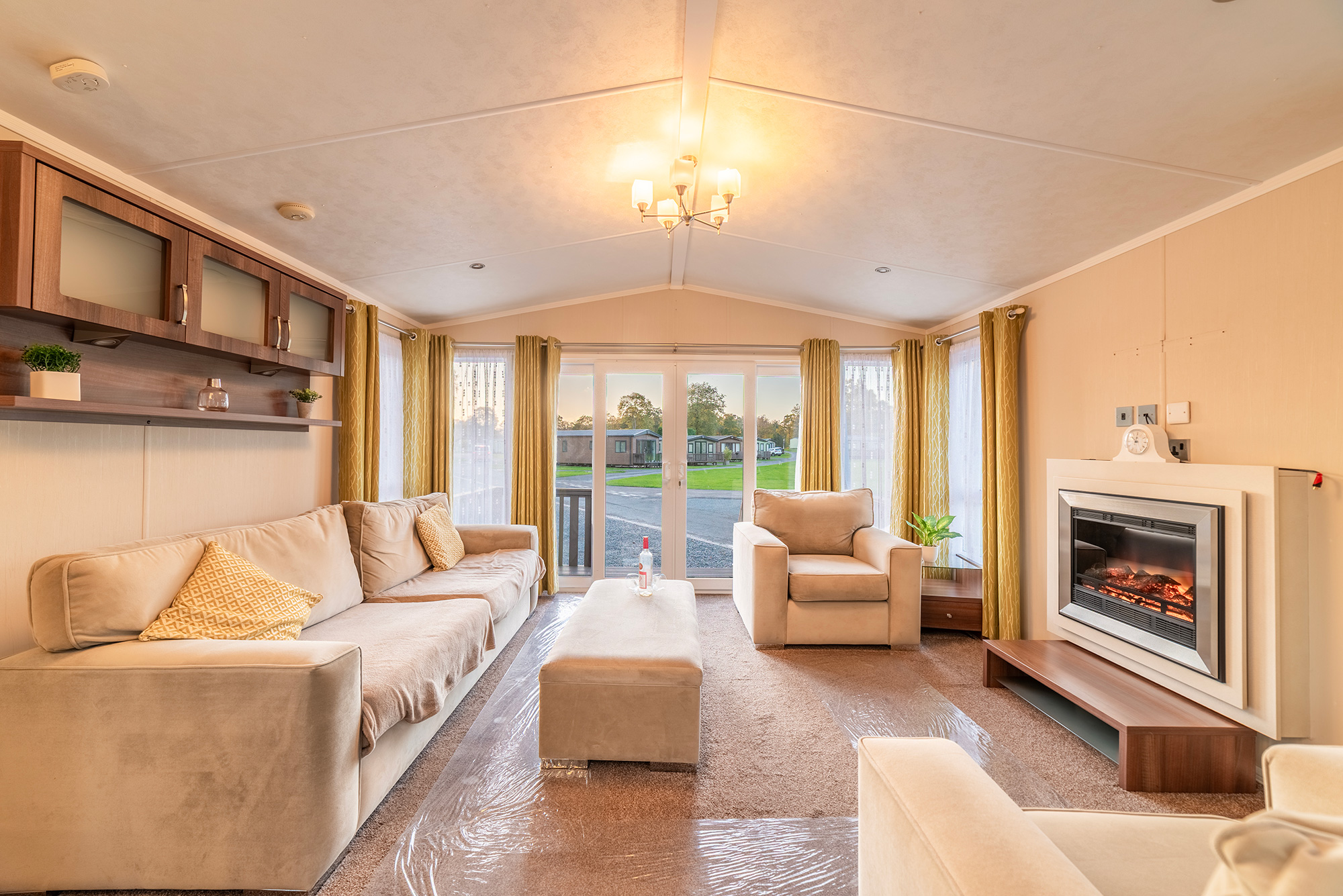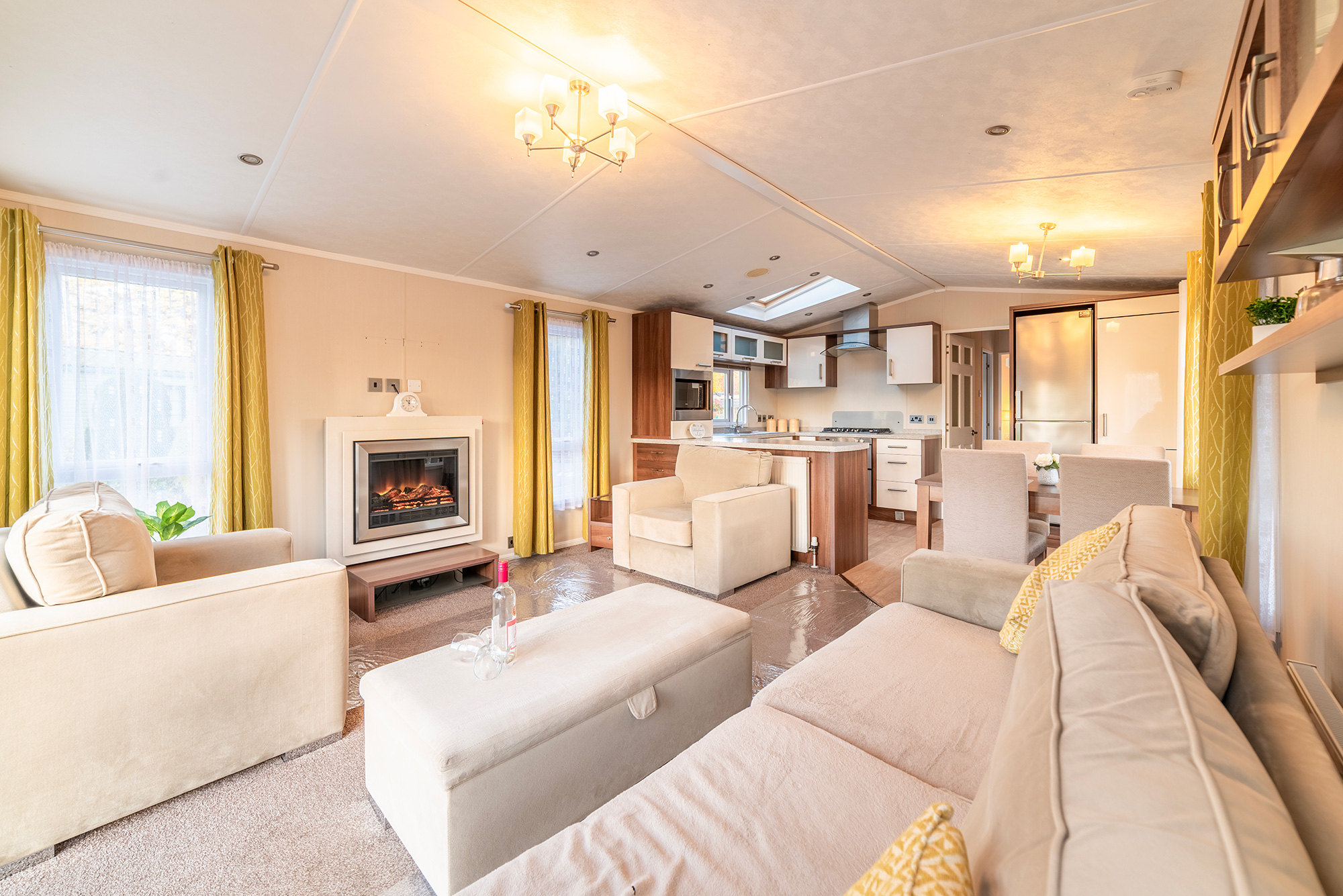 In the lounge area you’ll find a four-seater sofa (also a sofa bed), plus 2 occasional chairs and a large footstool. There’s also an impressive coal-effected gas fire, for cosy evenings in, and lots of storage.
