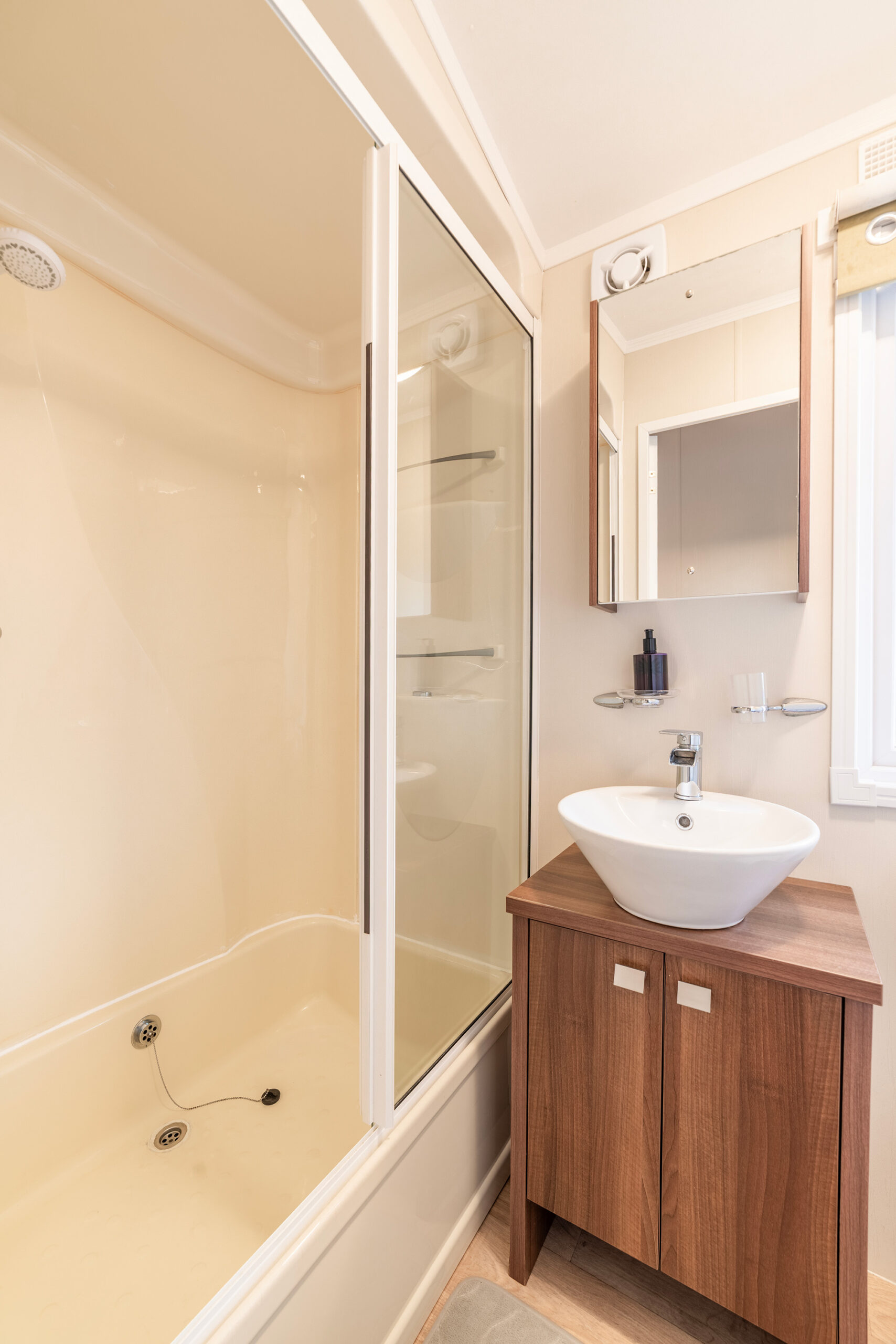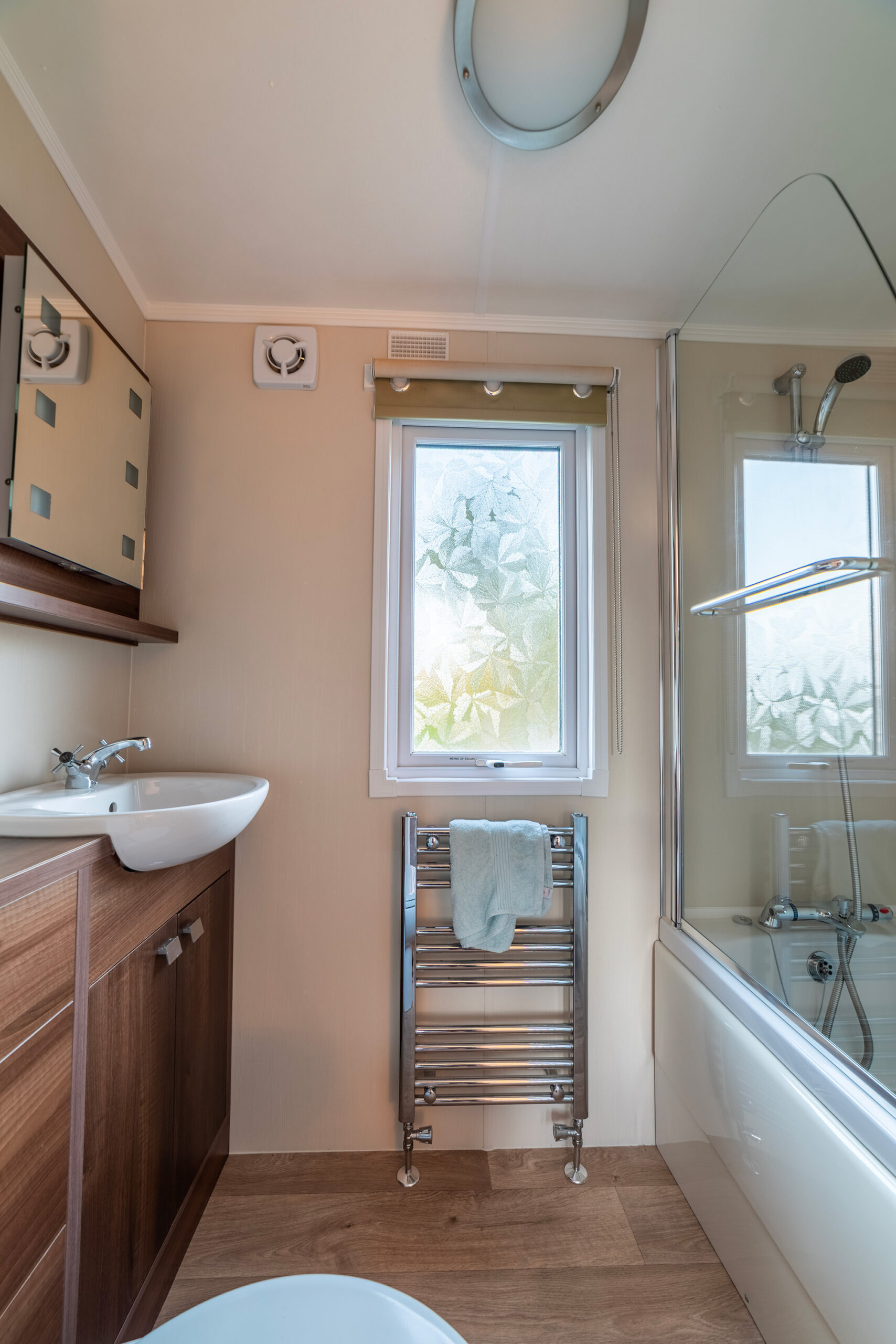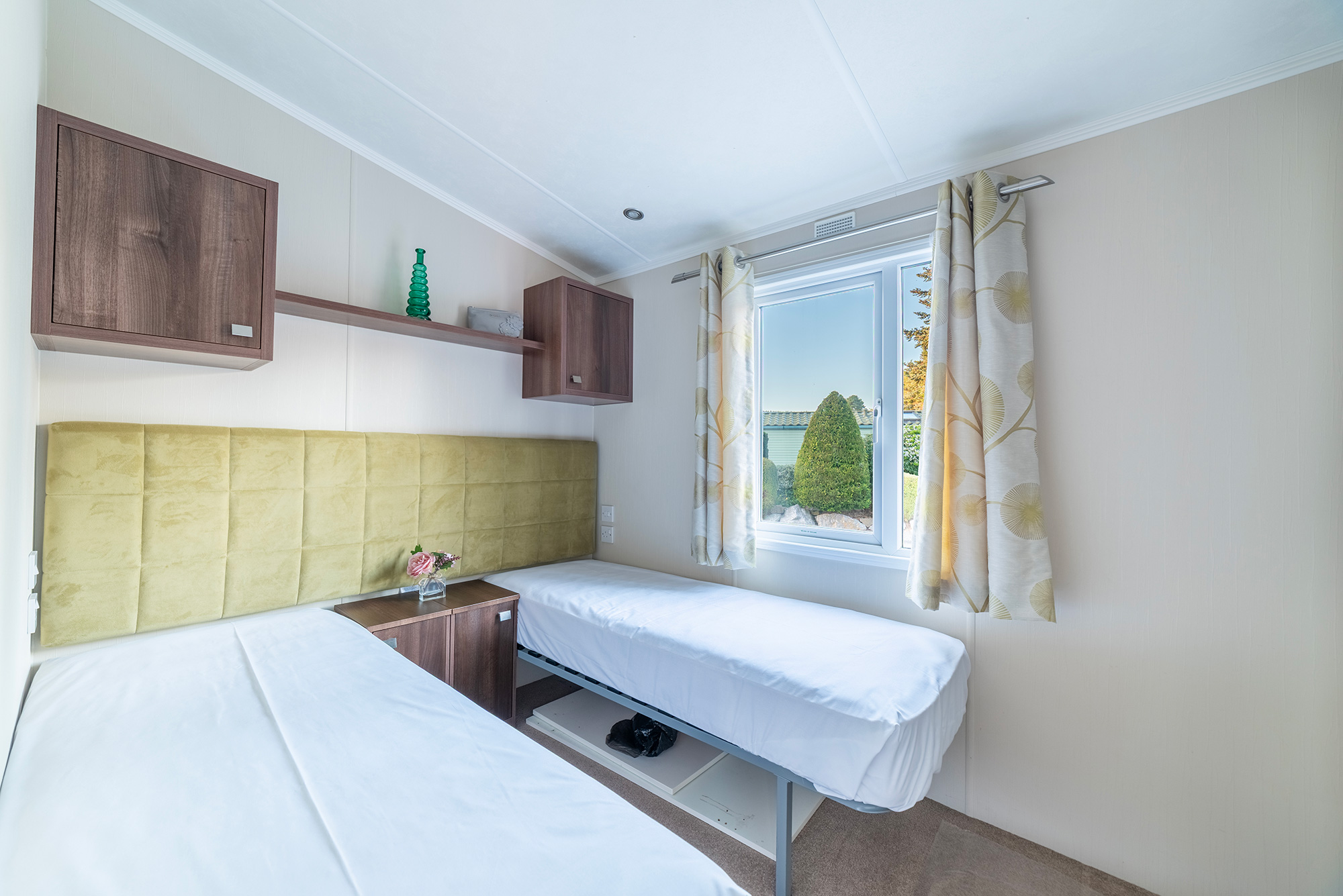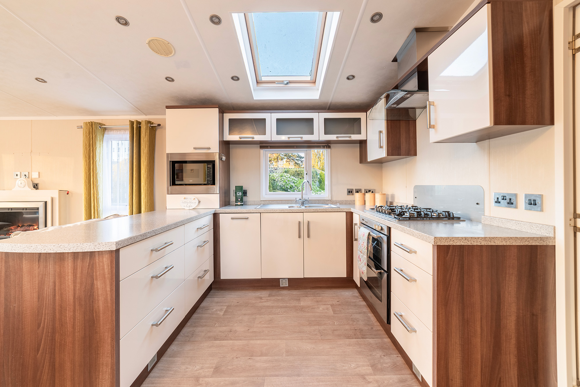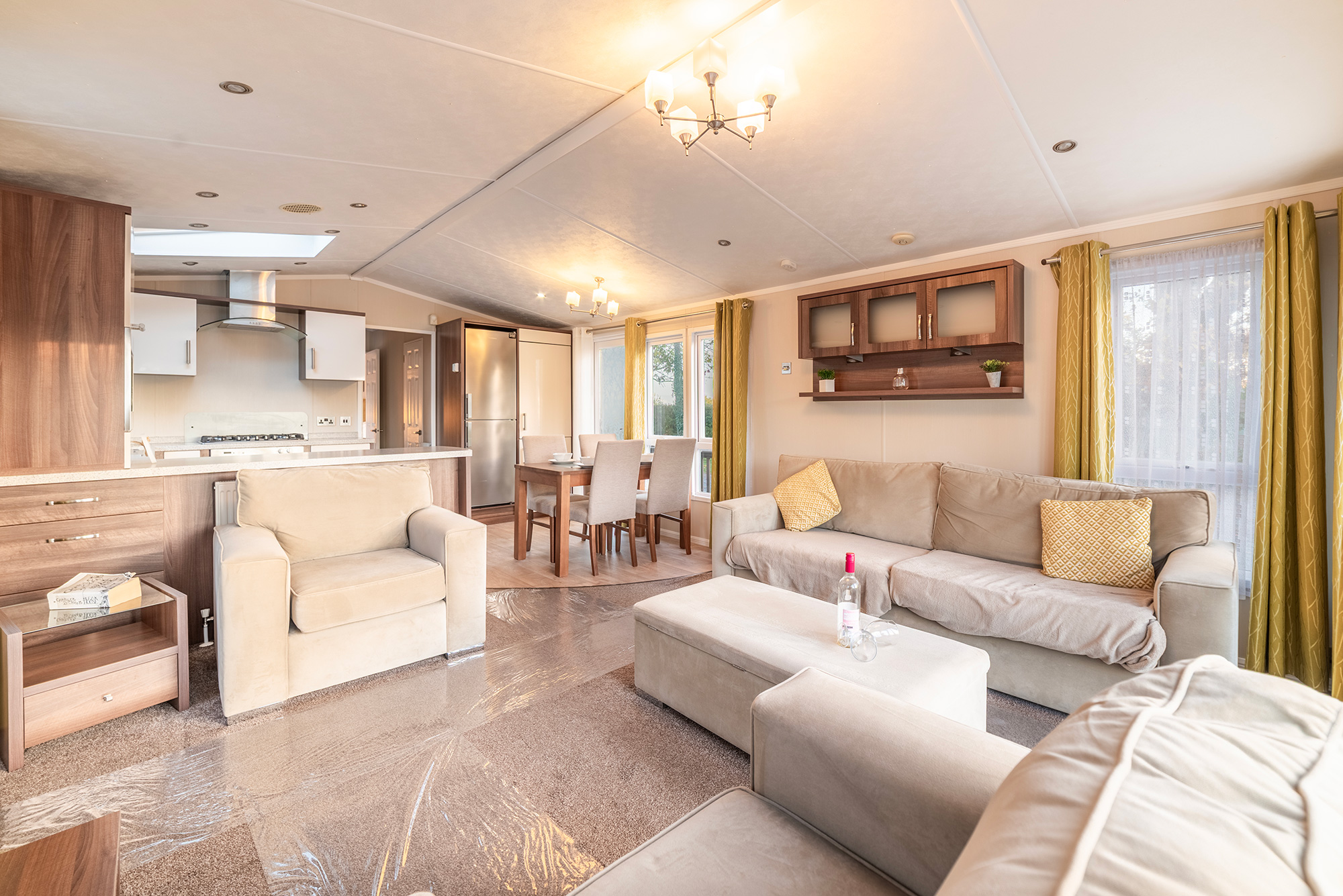 In the lounge area you’ll find a four-seater sofa (also a sofa bed), plus 2 occasional chairs and a large footstool. There’s also an impressive coal-effected gas fire, for cosy evenings in, and lots of storage.