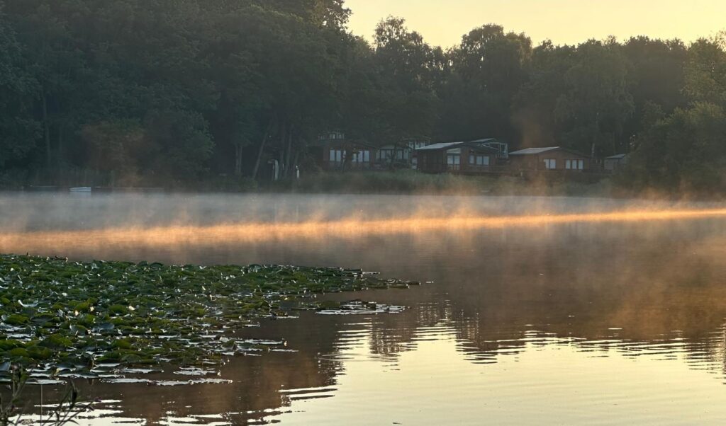 The 15 acre lake sits in an idyllic and peaceful location at Pearl Lake Country Holiday Park. It’s set amongst some dense woodland, particularly on its western side and is a proper carp anglers paradise. Both mirror and common carp are here in numbers and various sizes (up to 25lbs in 2025), but there’s also great tench (5-10lbs) fishing, with bream and perch in lesser numbers.